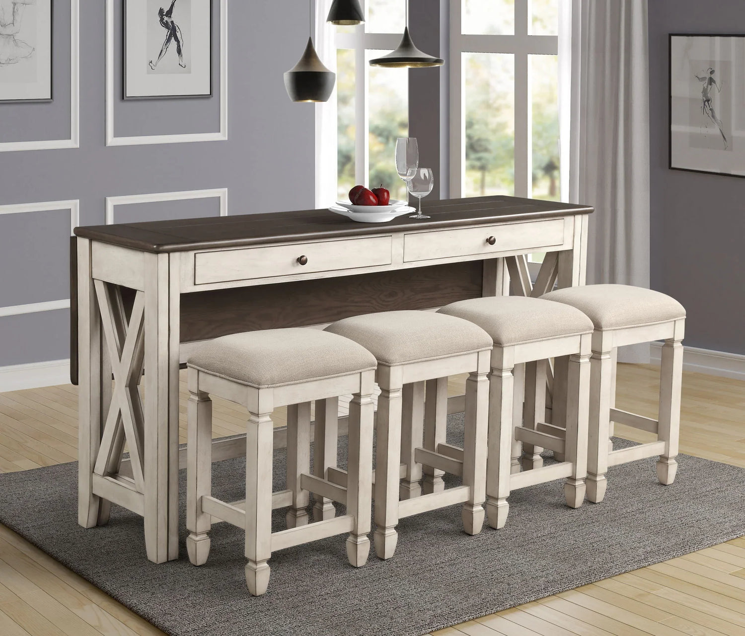 This five-piece counter-height set is designed for people who need flexible dining solutions in compact homes, apartments, or breakfast nooks. The drop-leaf top lets you expand the surface when guests arrive and tuck it away between meals, while four cushioned stools slide neatly under the apron to free up floor space.