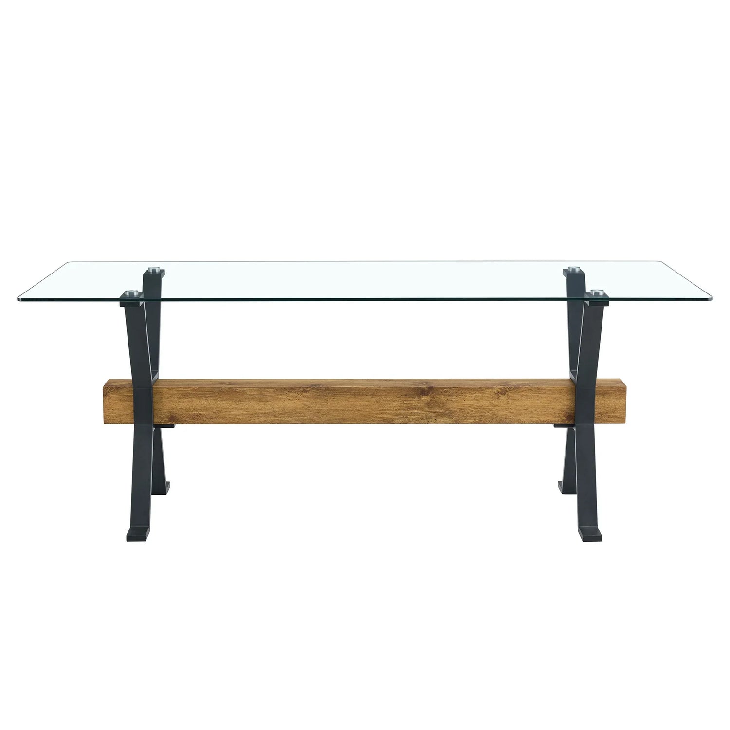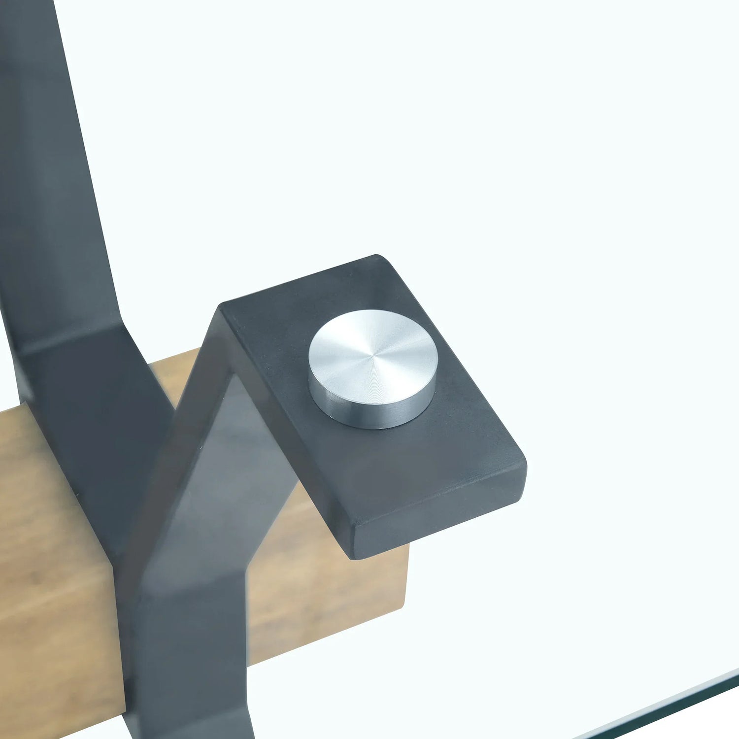 - Airy, modern aesthetic: Clear glass top keeps sight lines open and highlights the warm wood‑tone beam and architectural metal legs.