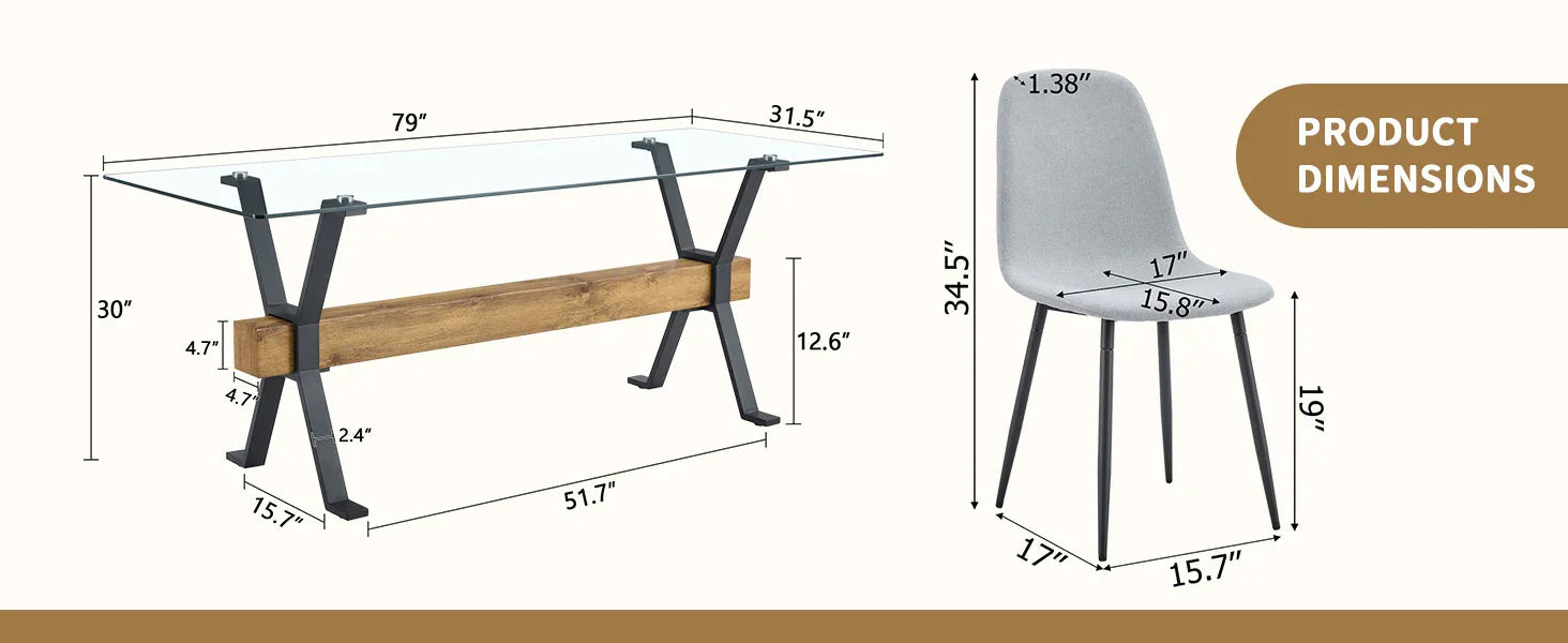 - Main materials: Tempered glass top, MDF (wood-finish) beam, metal base/legs, linen-style upholstered chairs.