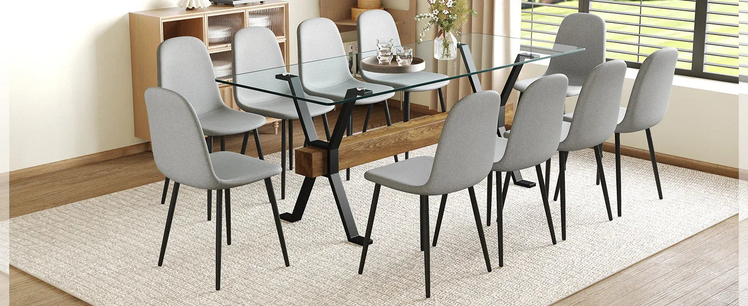 Clean-lined and sculptural, this glass-top dining set is made for homes that host — family dinners, holiday gatherings, or weekday meals with friends. The rectangular tempered glass top floats above a solid wood-look beam and angular metal legs, creating an open, airy silhouette that keeps the room feeling spacious while comfortably seating 10 or more. Upholstered chairs in a soft light‑gray linen blend add casual comfort and a polished contrast to the glass and black metal base.