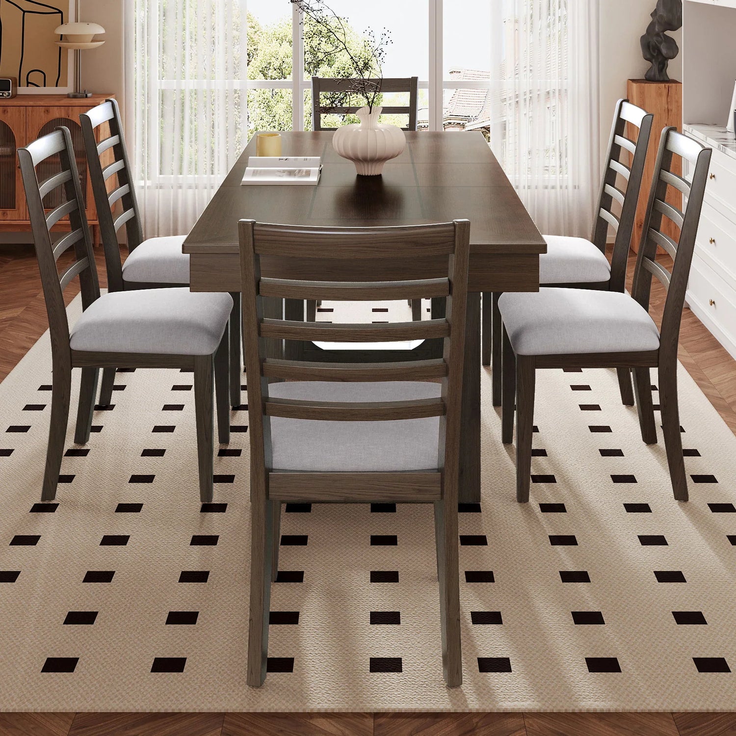 - Extendable Dining Set: Includes a rectangular dining table and f upholstered chairs with trapezoidal backrests, blending modern design with farmhouse charm - perfect for family meals or stylish entertaining.