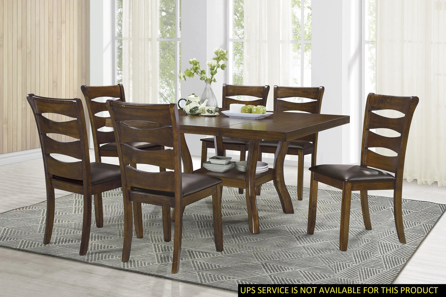 Built for everyday family meals and weekend gatherings, this 7‑piece dining set pairs transitional charm with practical function — a solid choice for a mid‑sized dining room or open plan dining area. The warm brown wood finish and ladder‑back chairs create a welcoming, timeless look that works with classic or modern decor, while the self‑storing butterfly leaf makes it simple to expand the table when guests arrive.