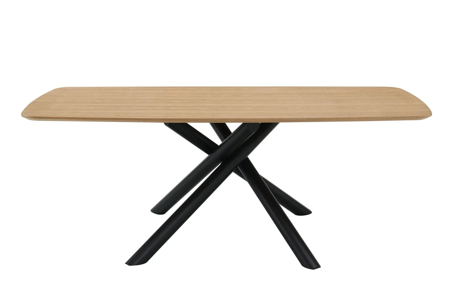 Use it as your primary dining set or as a refined focal point in a multipurpose dining area. The table’s fixed rectangular top and sturdy cross-leg base deliver everyday stability; the fully padded swivel chairs combine lounge-like comfort with easy access, so getting seated and passing dishes feels effortless. Visible materials include a natural-finish wood tabletop (composite with veneer), matte black metal bases, and boucle upholstery on the chairs — screens and natural materials may show subtle variation in tone and texture.