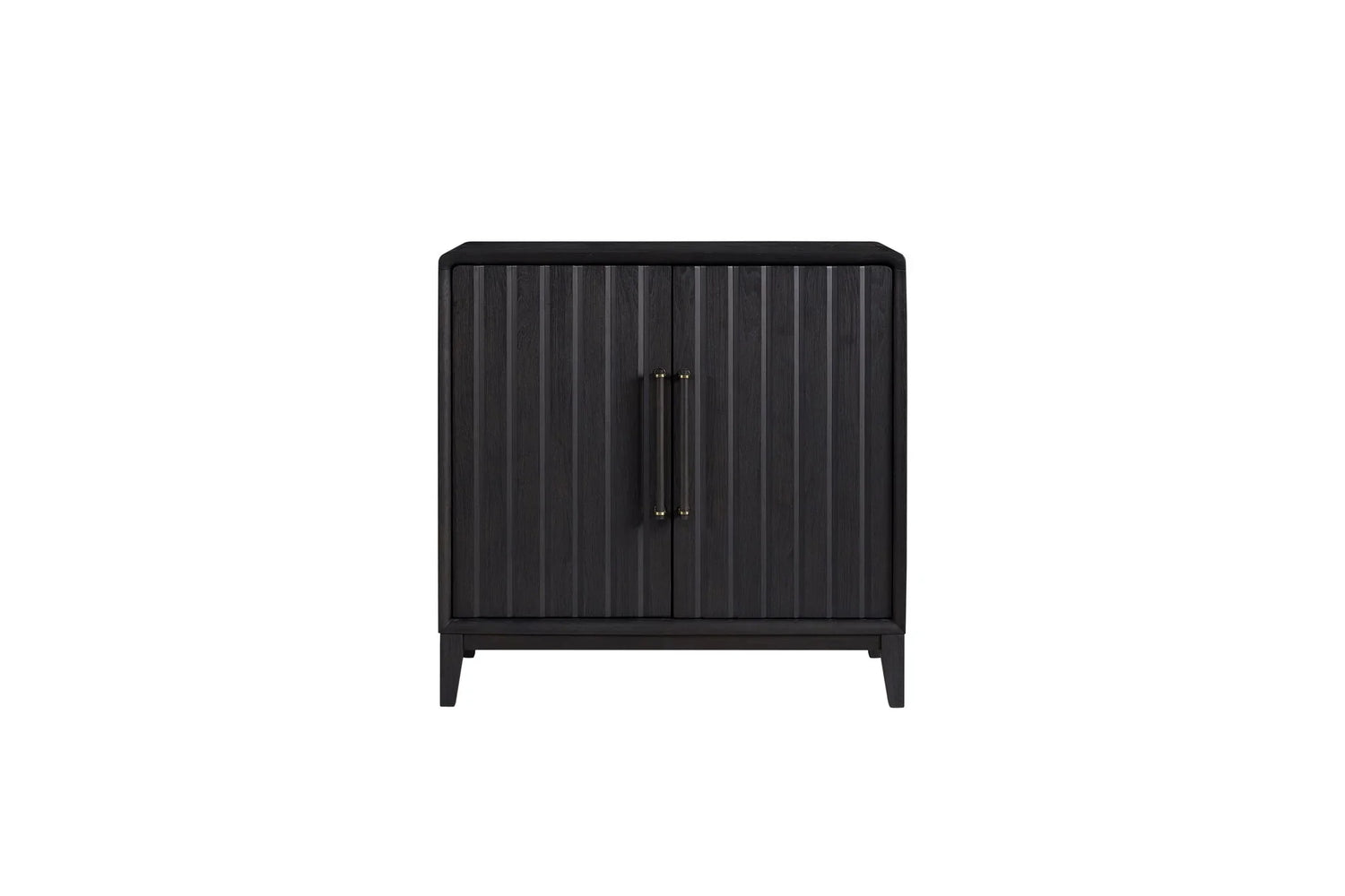 Day-to-day, this cabinet works as a tidy drinks station and an attractive storage piece: vertical fluted doors hide shelves and stemware while tall metal pulls give confident, ergonomic access. Constructed in wood with a deep peppercorn (near-black) finish, the cabinet shows subtle woodgrain texture and a matte-to-satin appearance; natural variations in wood and finish mean each piece will read slightly different on screen and in person.