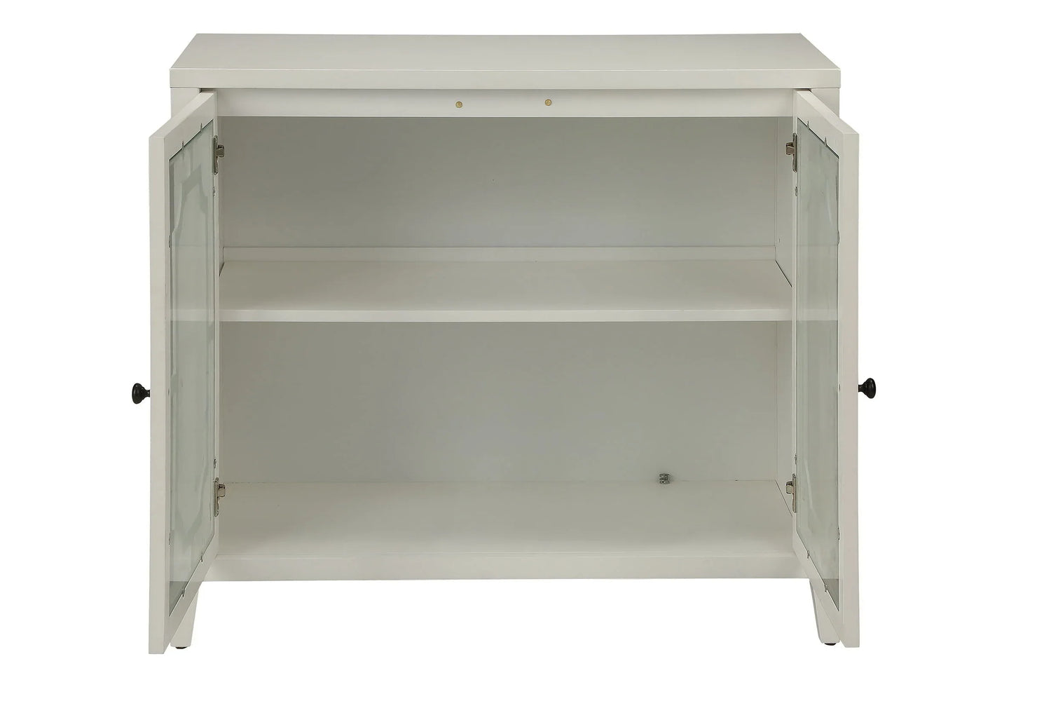 - Design and Structure: The Ceara White Finish Console Cabinet features a sleek rectangular design with two glass doors, providing an elegant aesthetic. It is supported by wooden tapered legs, offering a modern touch to any room.