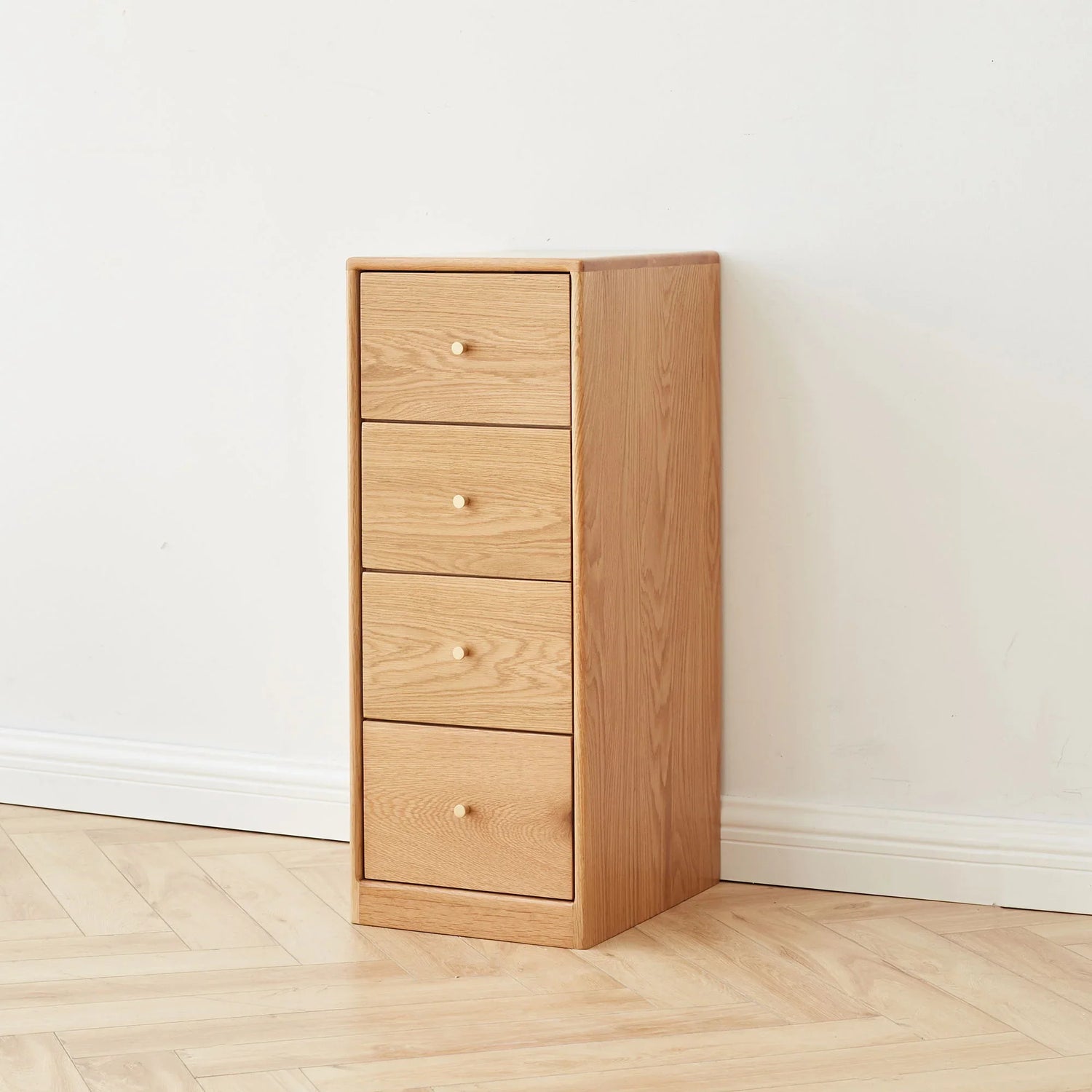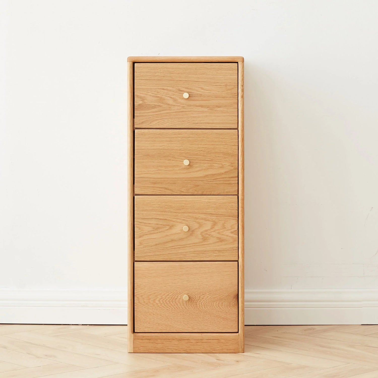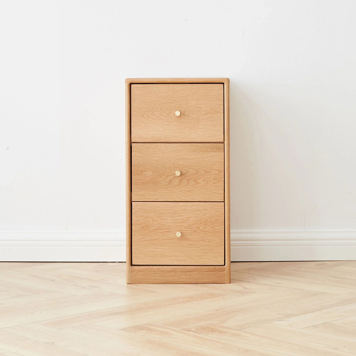 Built with clean lines and a warm natural wood look, the cabinet pairs practical storage with a calm, modern aesthetic—three full‑height drawers provide organized space for books, media, linens, or entryway clutter. Rounded outer edges and small metal knobs give the piece a refined, contemporary feel; natural grain and finish may show slight variation, adding to its handcrafted appearance.