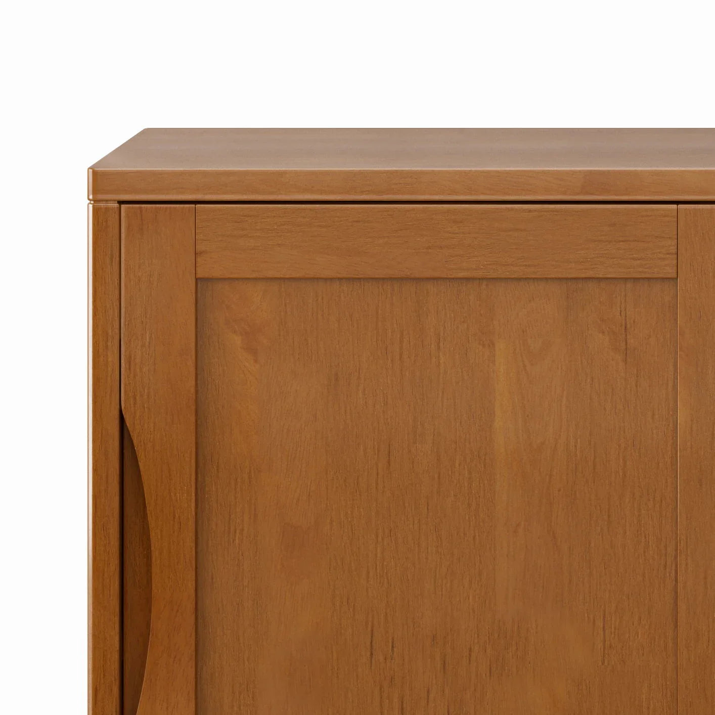 - Mid Century Modern design includes notched handles on doors and angled tapered legs