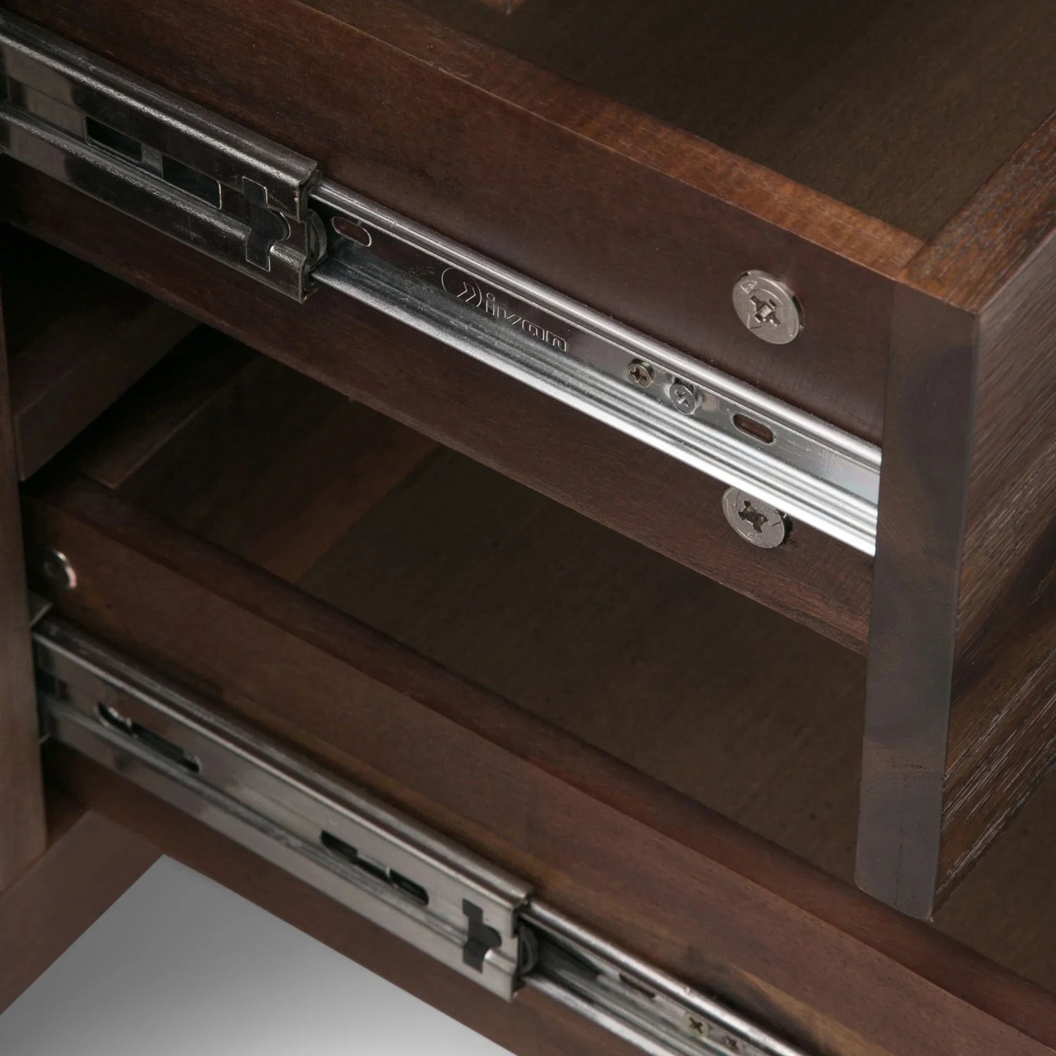 Day to day, Lowry works as a serving surface, media console, or linen storage. The design combines a rich, reclaimed‑look wood top and doors with three central drawers for sorted storage and two full‑height cabinets for larger items. Built for practical living, its solid wood grain and dark metal base make it an understated focal point that wears well with everyday use.