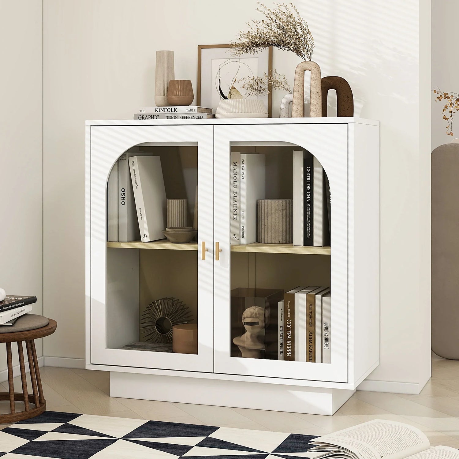 Daily use is simple: two arched acrylic panels create a modern, architectural look while a single adjustable shelf lets you tailor interior space. Small details — slim brass‑tone pulls, a recessed pedestal base and micro‑adjust door buckles — give the cabinet a refined, gallery‑like presence in compact living areas.