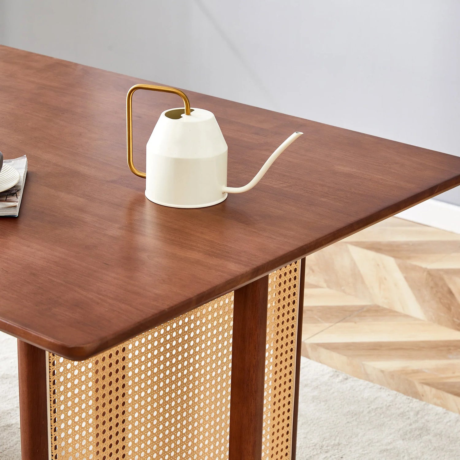 Pair this walnut dining table with light or neutral upholstered chairs to highlight the warm finish, or choose woven cane-back chairs to echo the table's textured leg panels. A low-profile runner and a simple centerpiece keep the table feeling modern and uncluttered for everyday dining or entertaining.