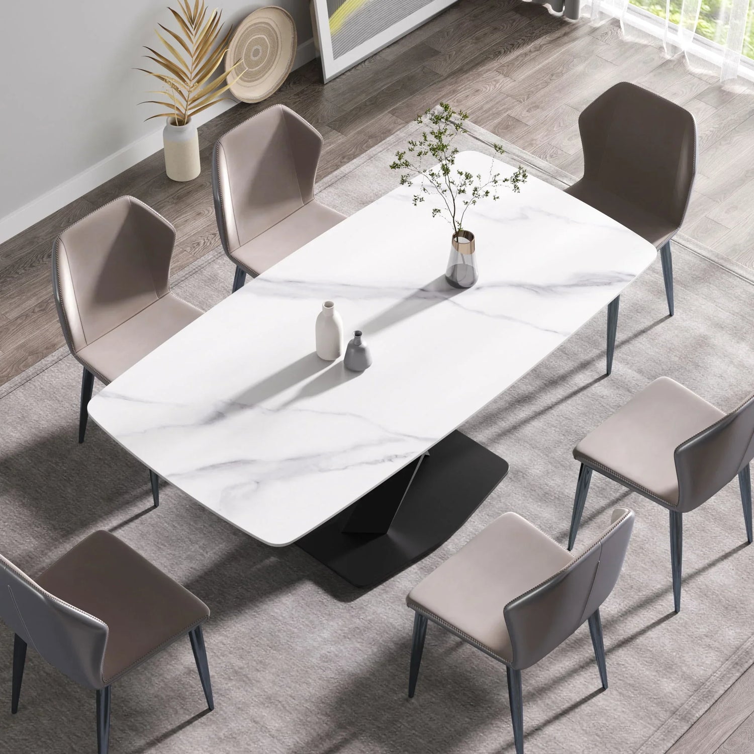 Pair with streamlined upholstered or metal‑framed dining chairs to maintain a modern aesthetic; choose chairs with a seat height that complements standard dining heights. The white, subtly veined top reads well with warm wood tones for contrast or with black accents for a monochrome statement. Keep centerpiece items low to showcase the clean tabletop lines and the X‑base silhouette.