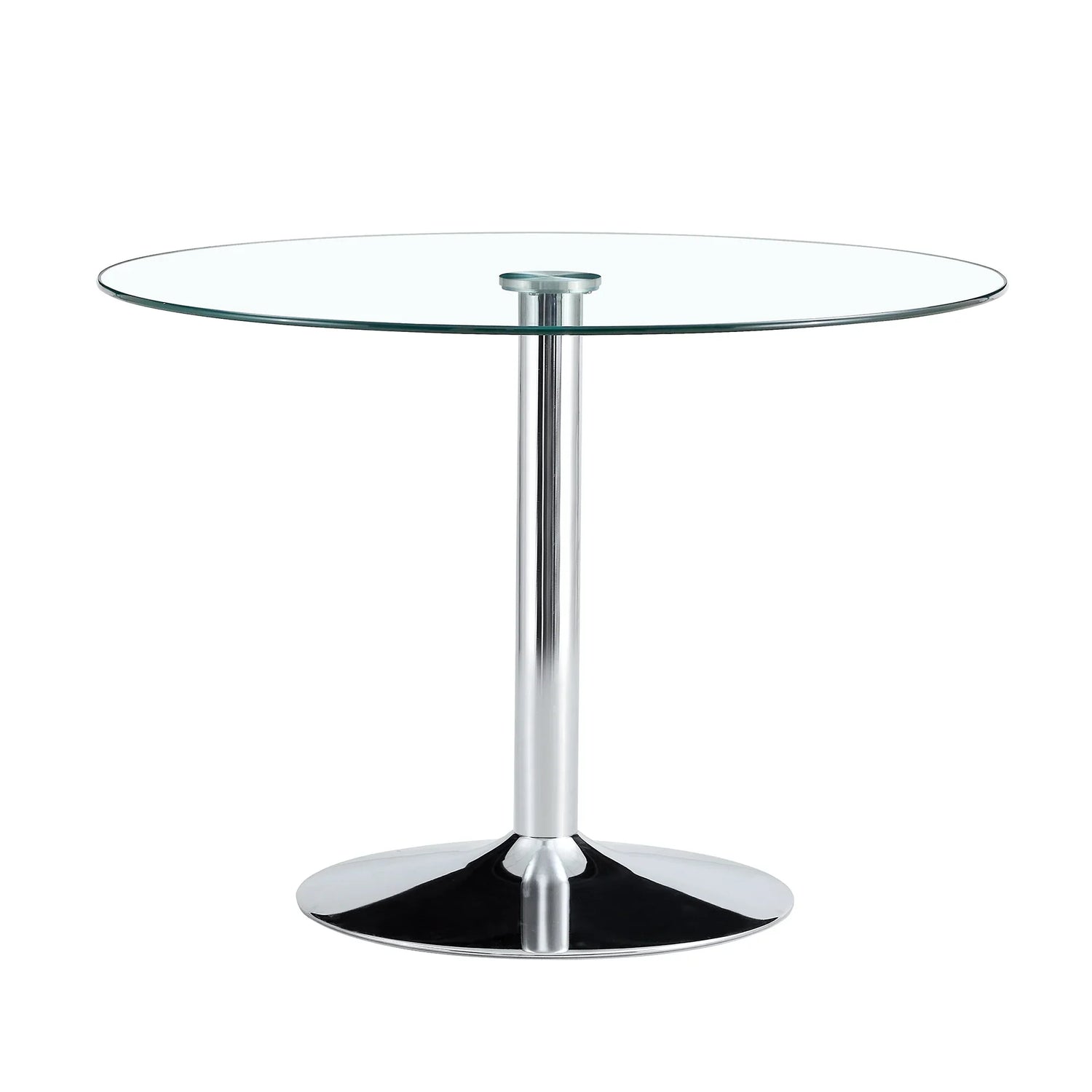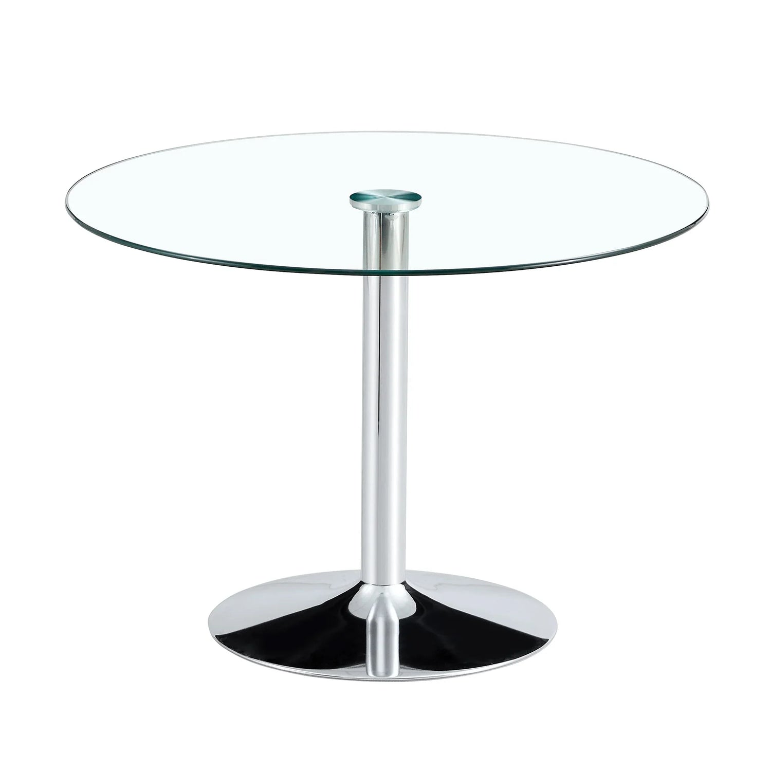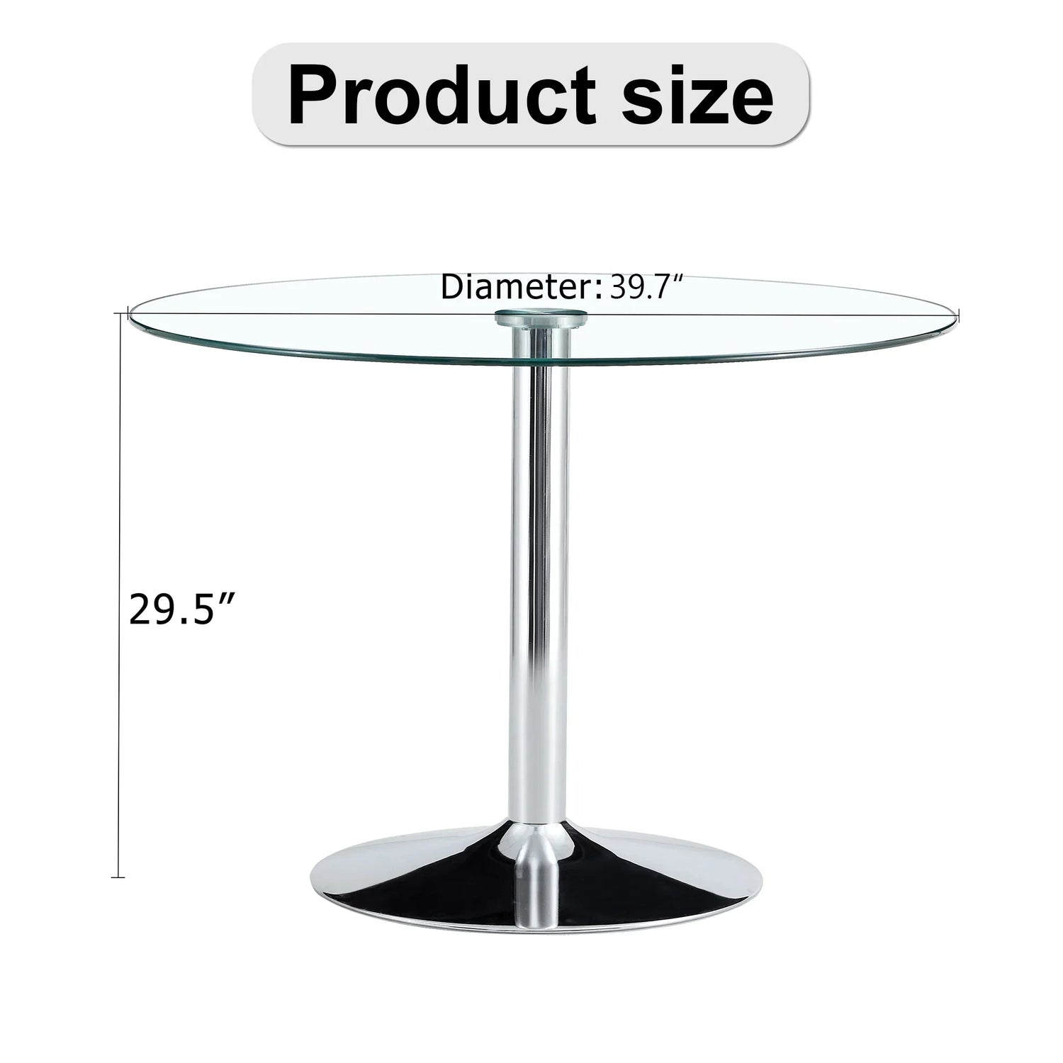 Perfect for modern kitchens, small dining nooks, or a minimalist apartment, this round dining table pairs a transparent glass top with a polished chrome pedestal to create an open, airy focal point. It seats up to four comfortably and works equally well as a breakfast table, compact dining set, or an elegant occasional table for entertaining. The clean silhouette and reflective metal base keep sight lines clear, making small rooms feel larger.