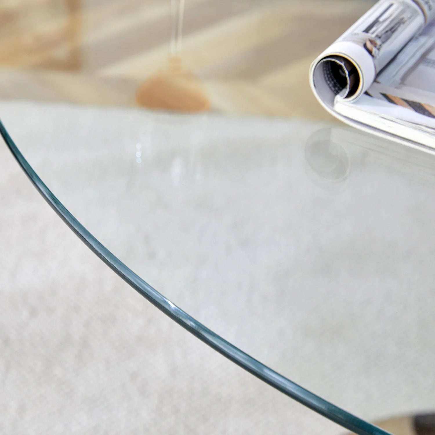 - Finish & color: Transparent tabletop with silver/chrome metal — reflective, polished sheen. Natural variations and light reflections may occur.
