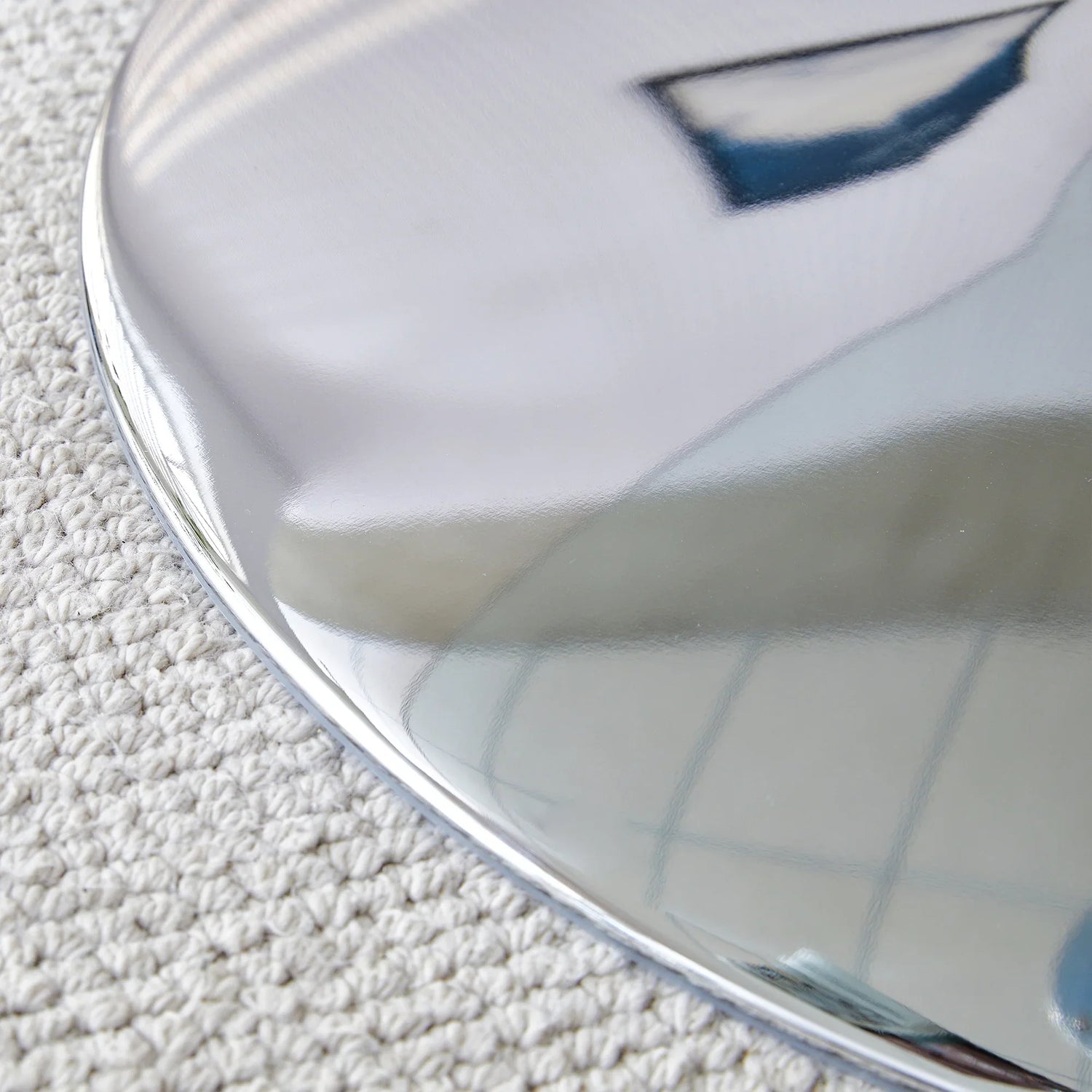 Handle the glass top with care during assembly and placement. For stability, place on a flat, even surface and avoid dragging the table. If using near high‑traffic areas or with young children, follow standard glass‑furniture safety practices and avoid leaning heavily on the tabletop. Screens and lighting may show reflections in the chrome finish — this is a normal characteristic of polished metal.