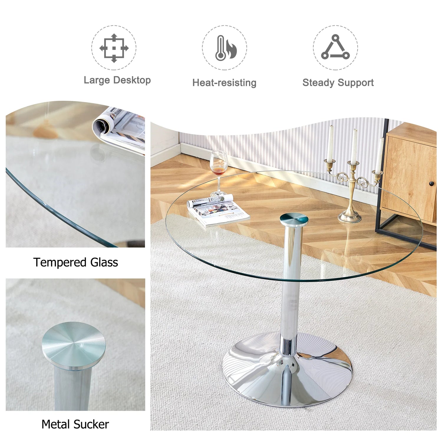 Day‑to‑day the table is low‑maintenance — the smooth glass surface wipes clean and the single‑column pedestal gives generous legroom and easy access from every seat. Construction combines a clear glass top with a chrome‑finish metal pedestal and weighted circular base for stable support and modern appeal. Screens and natural light may show subtle reflections or variation on the metal finish; this is normal and part of the table’s polished look.