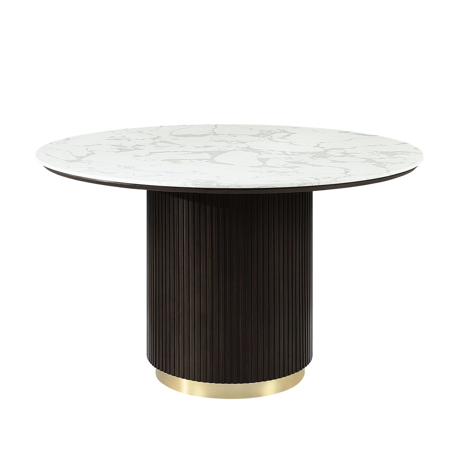 Designed with a white artificial marble surface and a fluted dark-espresso wood pedestal, Clayten balances luxe materials with lived-in practicality. The marble-look top offers a chic, easy-to-style backdrop for meals and décor, while the cylindrical, ribbed base and brass-toned plinth add visual weight and tactile detail—so the table performs as well as it looks.