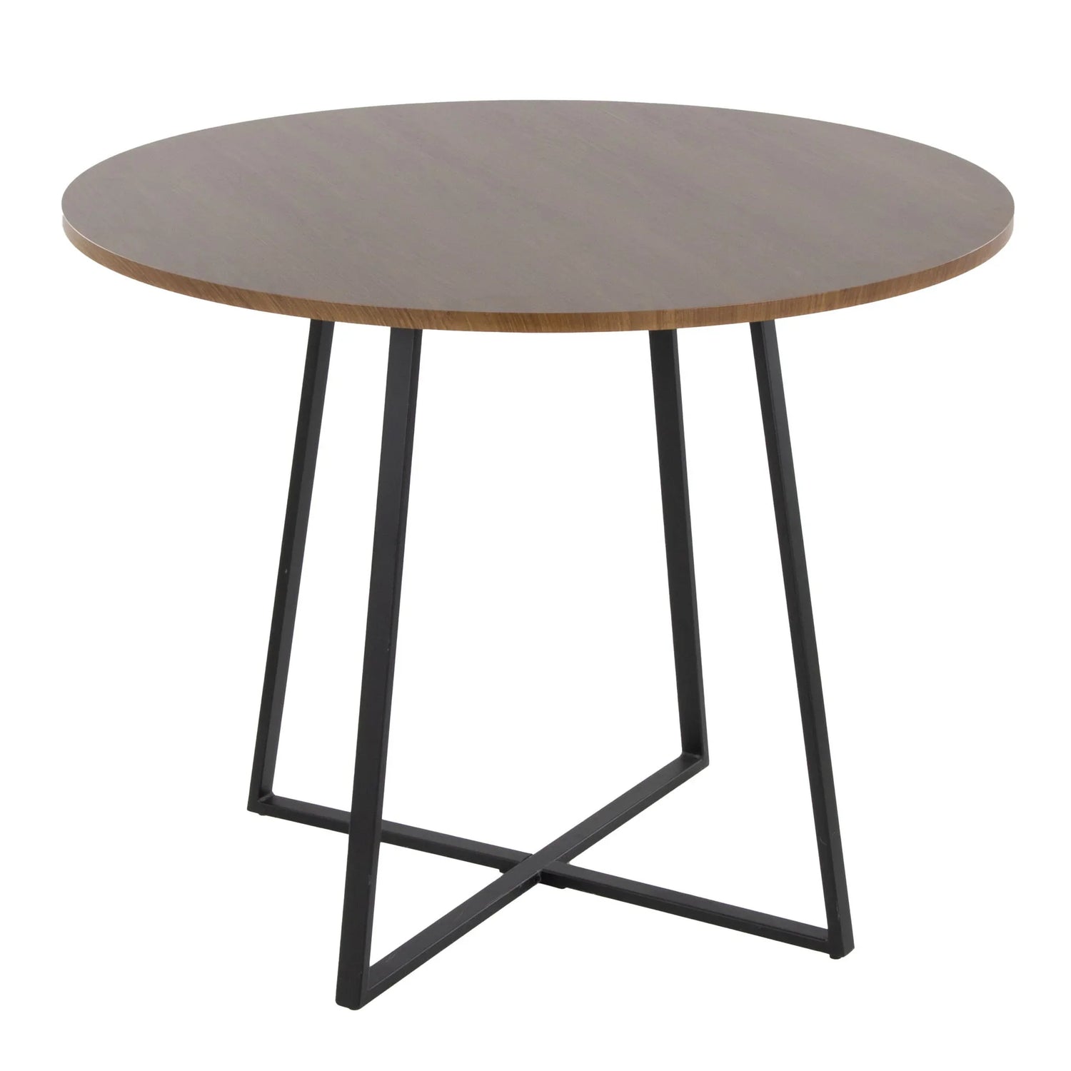 - Product Specifications: The table is fixed at dining height with a round wooden top and black metal base. It is intended for indoor use only, with a weight limit of 100 lbs, and requires assembly.