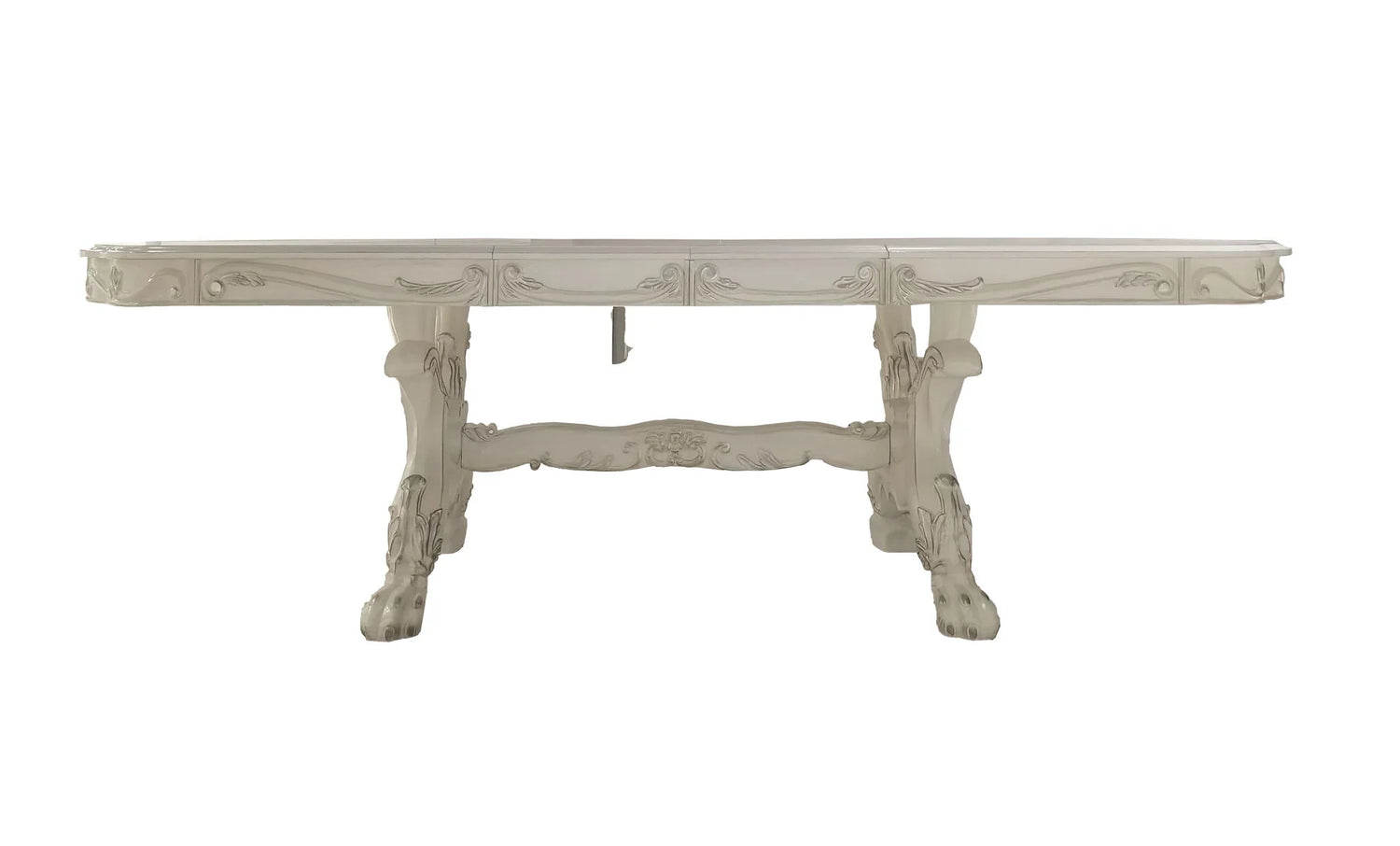 Designed with an expandable top that includes two removable plain leaves, Dresden adapts from a generous everyday table to a full-length host’s table to fit larger gatherings. Crafted from solid wood with a decorative carved stretcher and claw-style feet, the piece pairs ornate, traditional carving with a polished, modern finish—bringing timeless craftsmanship into contemporary interiors. Screens and natural materials may show slight finish variation; the table is shown here in a pearl-silver finish with darker brown undertones that highlight the carved details.