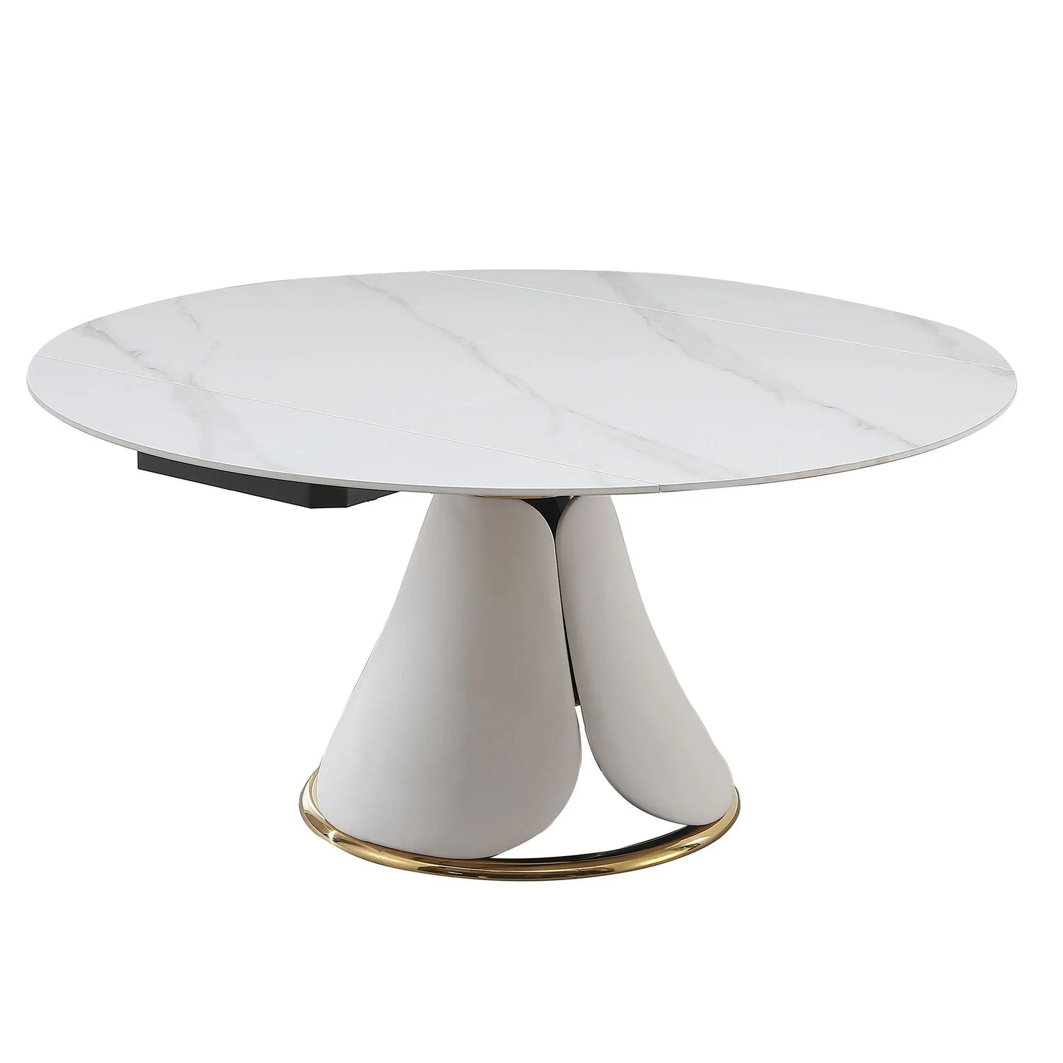 Everyday-friendly and smartly engineered: the sintered stone top resists stains, heat and scratches so plates, pans and accidental spills won’t show — while the multi-functional retractable mechanism lets you adjust the table’s layout for different occasions. The sculptural base (with a polished metallic ring accent visible at the bottom) anchors the piece and keeps legroom open for comfortable seating.