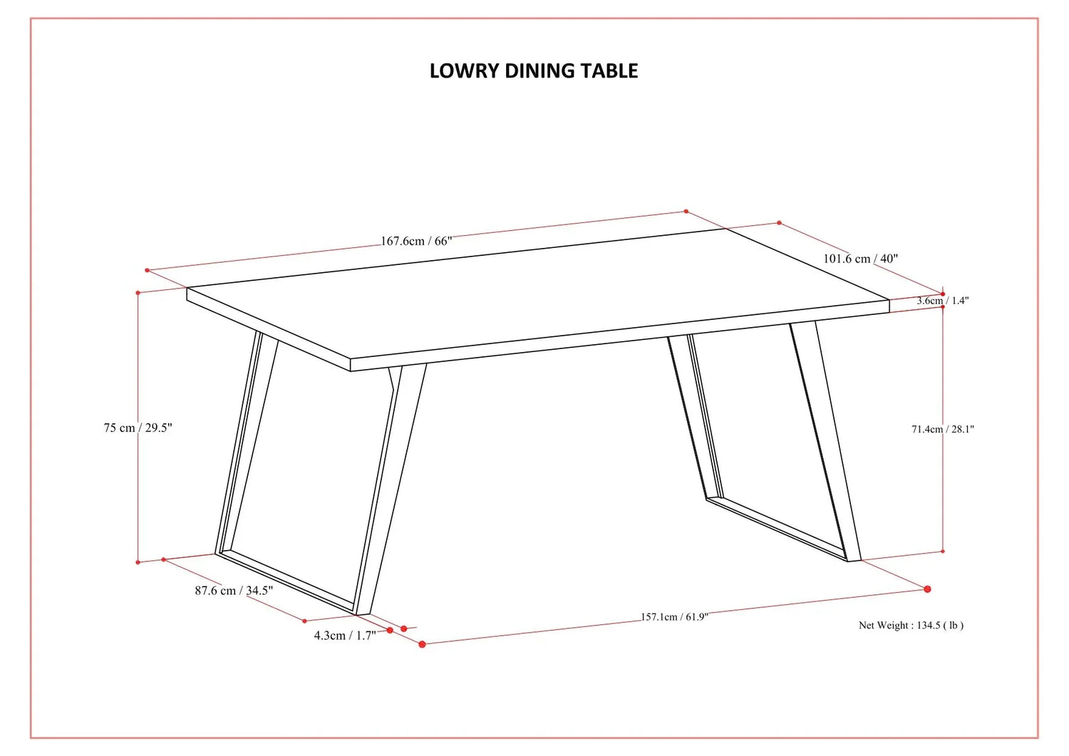 The Lowry table combines a real-wood veneer with an engineered core for efficient material use and dimensional stability. Because finishes and natural veneers vary, expect subtle color and grain differences between pieces and images. For safety, do not exceed the listed weight capacity (220 lb / 99.8 kg) on the tabletop; distribute heavy items evenly. If placing the table on uneven flooring, use adjustable leg protectors or shims to prevent rocking. Tip-resistance for free-standing dining tables depends on installation and room use—avoid placing heavy objects on one edge and follow standard household safety practices around active children.