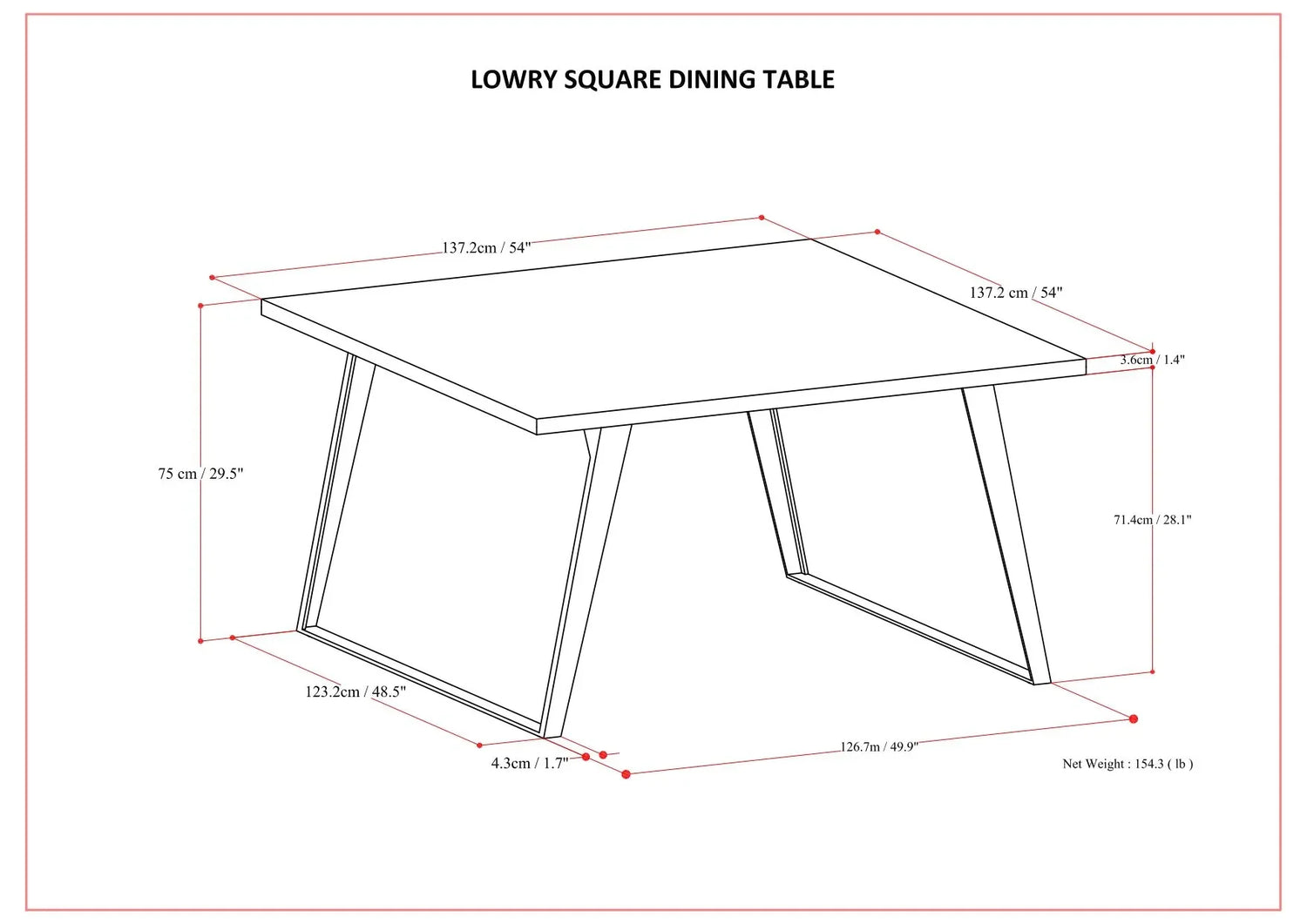 The Lowry Handcrafted Square Dining Table is designed for modern homes that need roomy, stylish dining without fuss. At 54" square (137.2 cm), it comfortably seats up to eight people, making it a great choice for family dinners, weekday meal prep, or hosting friends around a clean, contemporary surface. The table’s pared-back industrial silhouette—an ample, thick wood-veneer top set on angled metal legs—pairs equally well with mixed dining chairs or a bench for flexible seating.