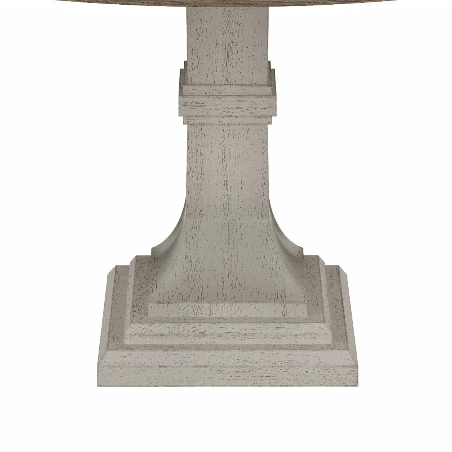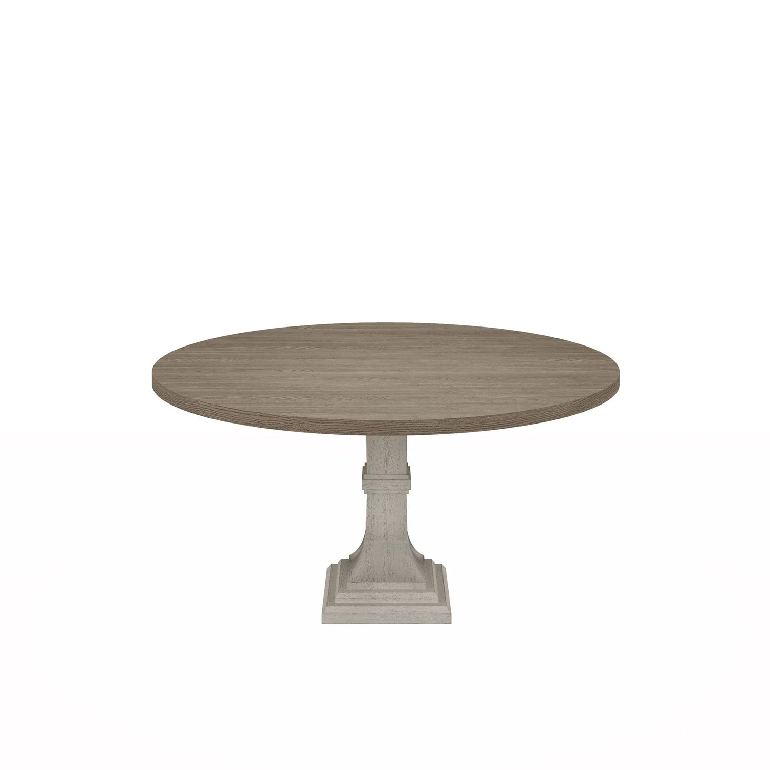 - Crafted for those who appreciate the finer details in their dining space, the Tannen Dining Table presents a harmonious blend of sophistication and rustic charm. This elegantly designed table features a generous 59" round tabletop that gracefully sits atop a sturdy white pedestal base, ensuring both stability and style. The natural grain variation across the table's surface adds an organic touch, beautifully contrasted by a distressed finish that brings an air of lived-in luxury to any room. This dining table promises durability and a timeless appeal, making it a perfect centerpiece for gatherings, meals, and memorable conversations.