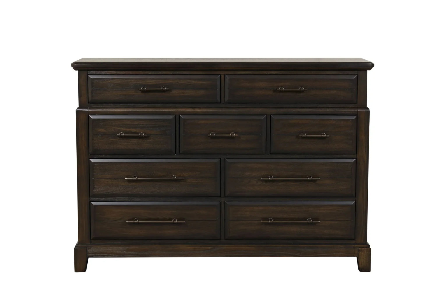 This roomy 9-drawer dresser is made for people who need generous, classic storage without sacrificing style — a strong anchor for a master or guest bedroom where organization and polish matter. Its deep mahogany finish and clean, framed drawer fronts create a timeless silhouette that complements traditional and transitional interiors while keeping everyday clothing, linens and accessories neatly stowed.