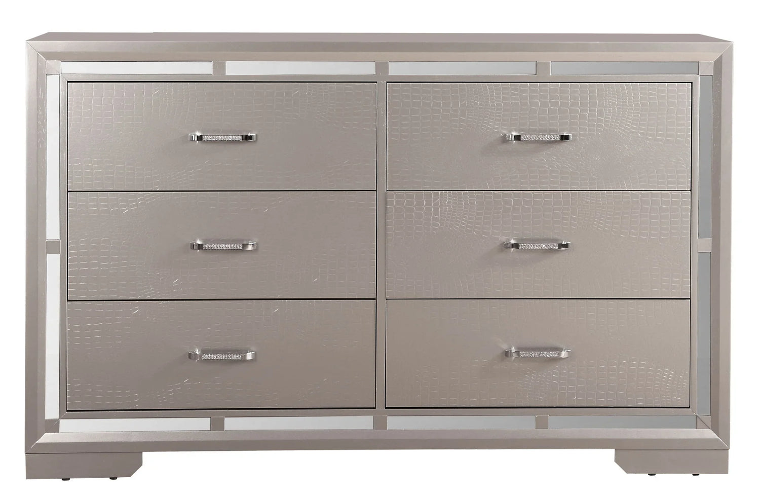 Use this dresser as a focal point under a mirror or paired with the coordinating Alana beds to create a cohesive bedroom set. Built on a solid wood frame, the dresser combines decorative detailing (mirror trim and croc-embossed faces) with everyday utility: deep drawers for organized storage, smooth-glide hardware, and a reflective trim that brightens the space. Note: natural material texture and screen settings may cause slight variation in the Silver Champagne tone.