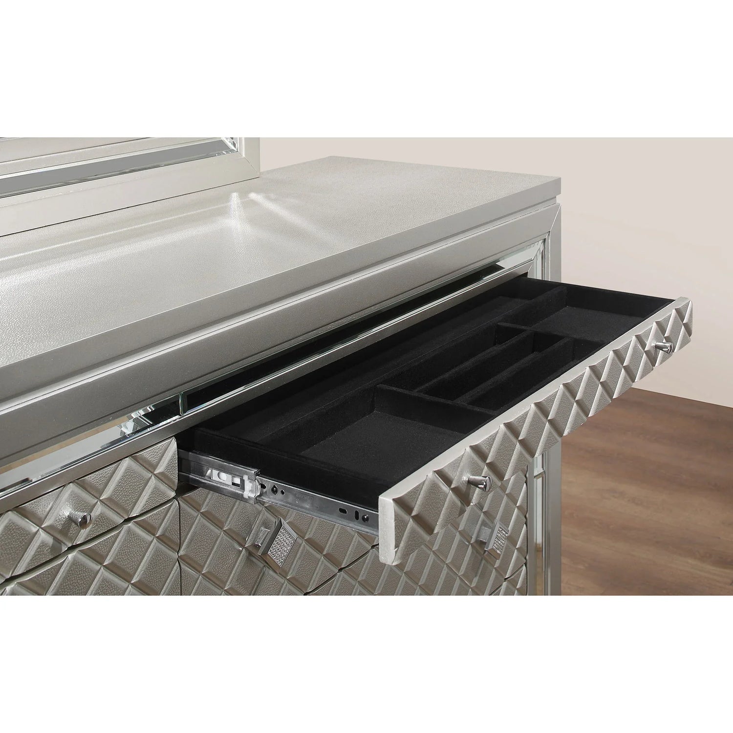Perfect for someone who wants a statement-making bedroom piece with real storage, the Cross - Glam Dresser in Champagne brings high-glam style to everyday life. It works well as the focal dresser in a master or guest suite—offering roomy drawers for folded clothing plus two felt-lined jewelry drawers to keep accessories organized and protected. The champagne finish, mirrored drawer fronts and jewel-embellished pulls create a luxe, reflective look that lifts both modern and Hollywood‑glam interiors.