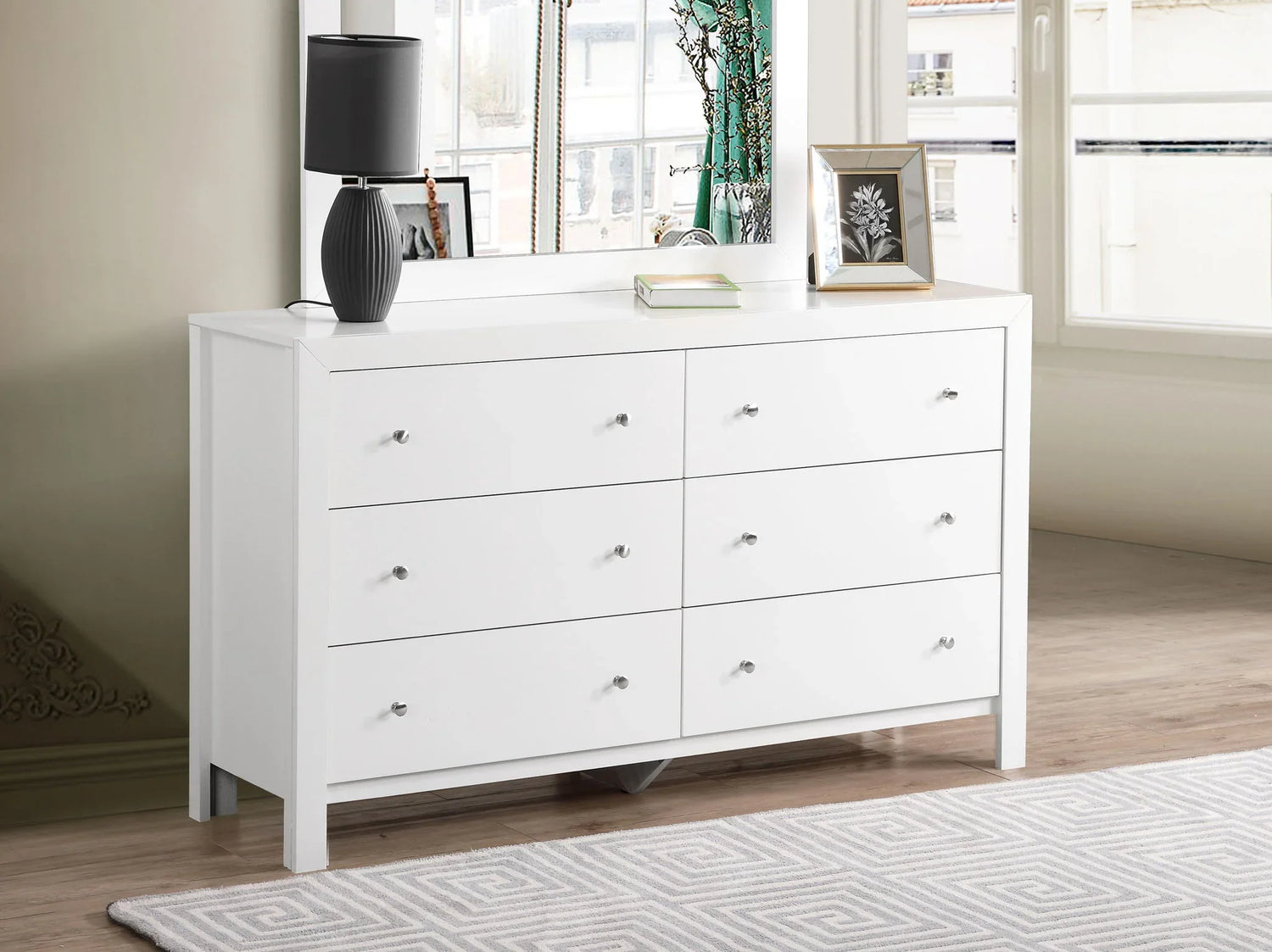 This dresser’s clean frame and polished nickel knobs work well with plush rugs, mixed-metal accents, and both matte and glossy bedside lamps. Top it with a low-profile mirror or a pair of small table lamps to create a balanced dresser vignette. Because of its moderate footprint, it suits medium and larger bedrooms—measure your space and doorways before delivery to confirm placement.