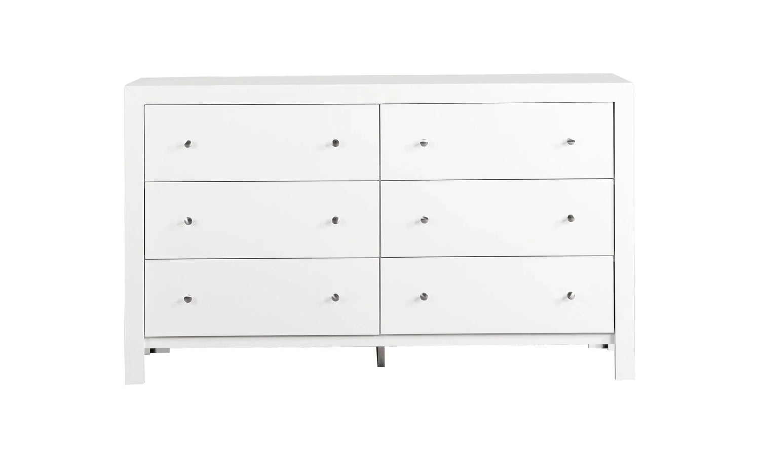 - Polished nickel hardware provides a refined accent that complements the dresser’s clean lines.