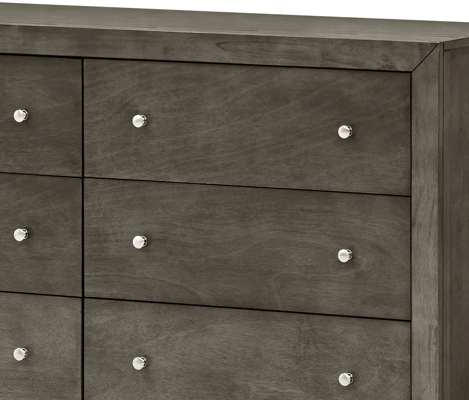 Every dresser arrives fully assembled and ready to use, with dovetail drawer construction and safety-stop guides for smooth, durable operation. Polished nickel knobs add a subtle, contemporary highlight against the soft gray wood grain finish shown in the photos—a versatile piece that reads modern transitional and pairs easily with both warm and cool palettes.