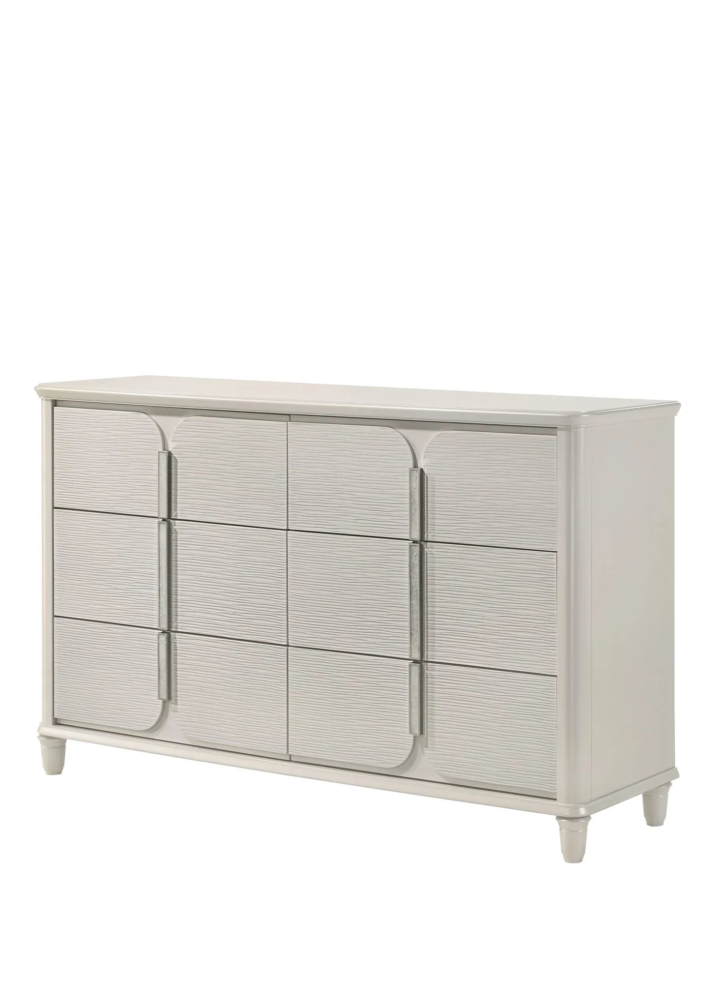 Clean-lined and quietly modern, the Laveda dresser in white is designed for anyone who wants roomy, organized storage with a refined, contemporary look. It fits easily in a bedroom or dressing area where you need six generous drawers for clothing, linens and everyday essentials, plus a concealed jewelry tray for small valuables. The carved, textured drawer fronts and polished vertical pulls give the piece a subtle, elevated presence that reads modern & contemporary without feeling cold.