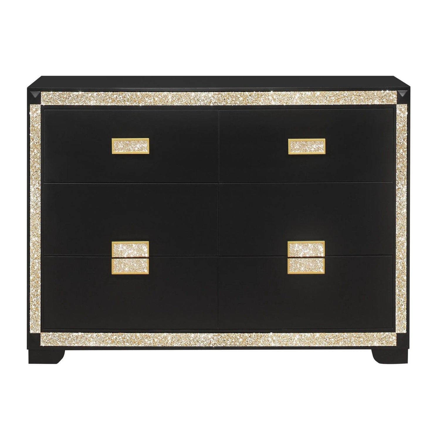 Designed for anyone who wants everyday storage with a touch of evening‑out glamour, this Lively dresser brings sparkle to a modern bedroom. The low‑profile silhouette and clean black finish provide a versatile backdrop for a variety of interiors—from contemporary to glam—while the glitter trim and thick bar handle hardware give it an unmistakable, elevated look. It’s a practical choice for people who need generous drawer storage without sacrificing style.