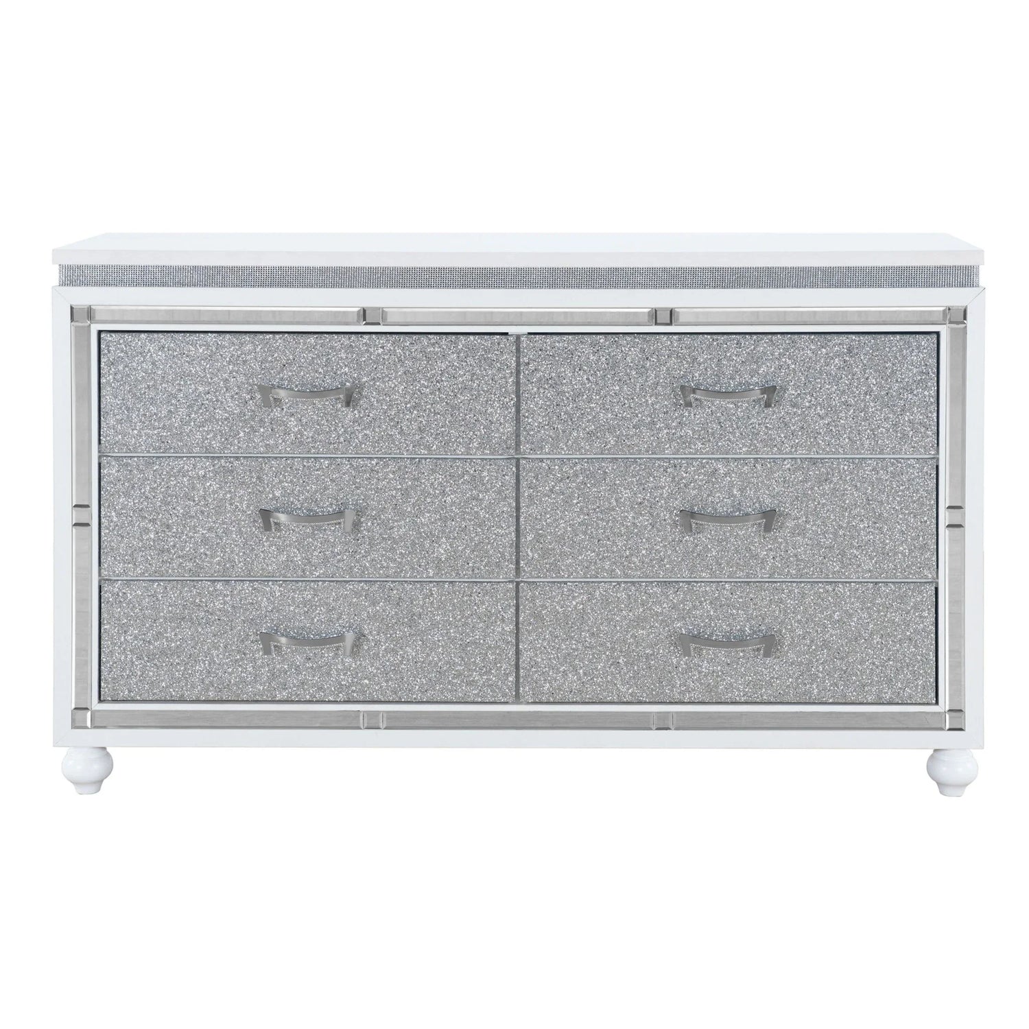 The Maloise Dresser in white is designed for anyone who wants a bedroom anchor that doubles as a statement piece — ideal for modern, contemporary, or glam-inspired rooms. With six roomy drawers and a low, wide silhouette, it fits naturally beneath a mirror or along a long wall to keep clothes and accessories organized while adding high‑impact sparkle to your space.