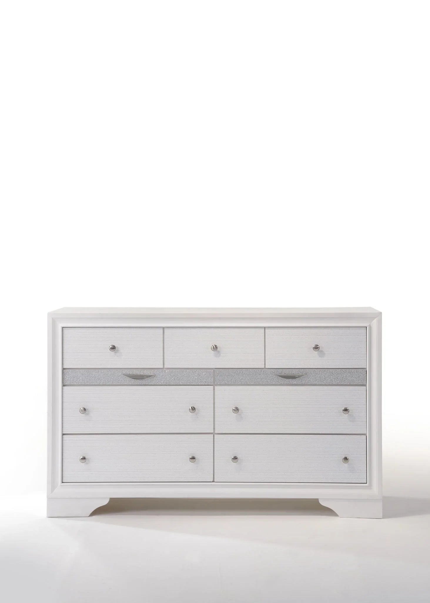 Pair the Naima dresser with a simple framed mirror or a mid‑sized decorative mirror to create a functional dressing area. Its textured white finish and silver hardware work well with cool greys, soft blush tones, or warm natural wood accents—add a plush rug and a low bench to complete a relaxed, contemporary bedroom layout.