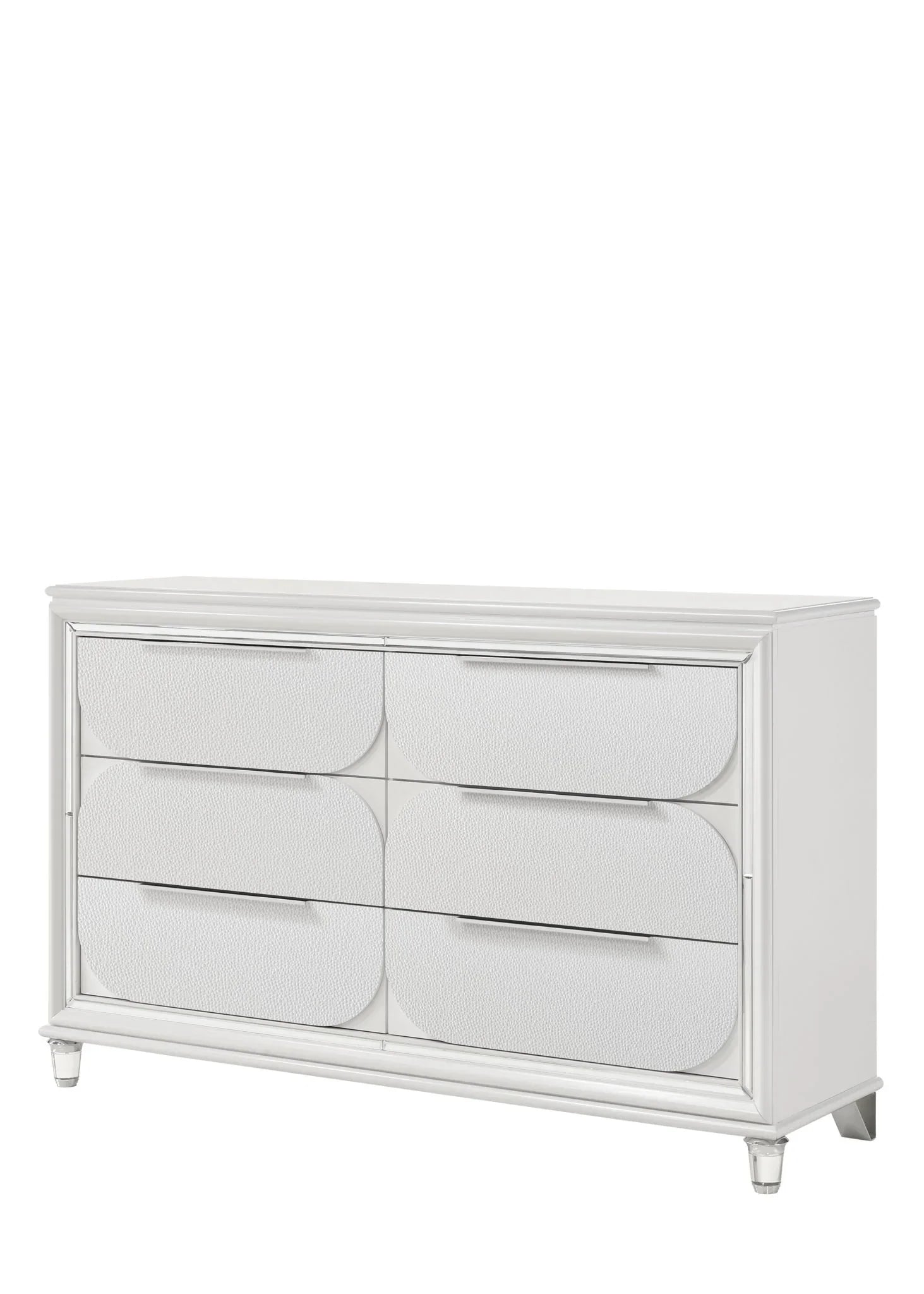 The Tarian dresser in white is crafted for style-minded homeowners who want a refined statement piece in a modern bedroom or dressing area. Its clean silhouette and embossed drawer fronts read contemporary while the acrylic crystal legs and slim metallic pulls introduce a subtle, elevated glamour that complements both minimalist and transitional interiors.