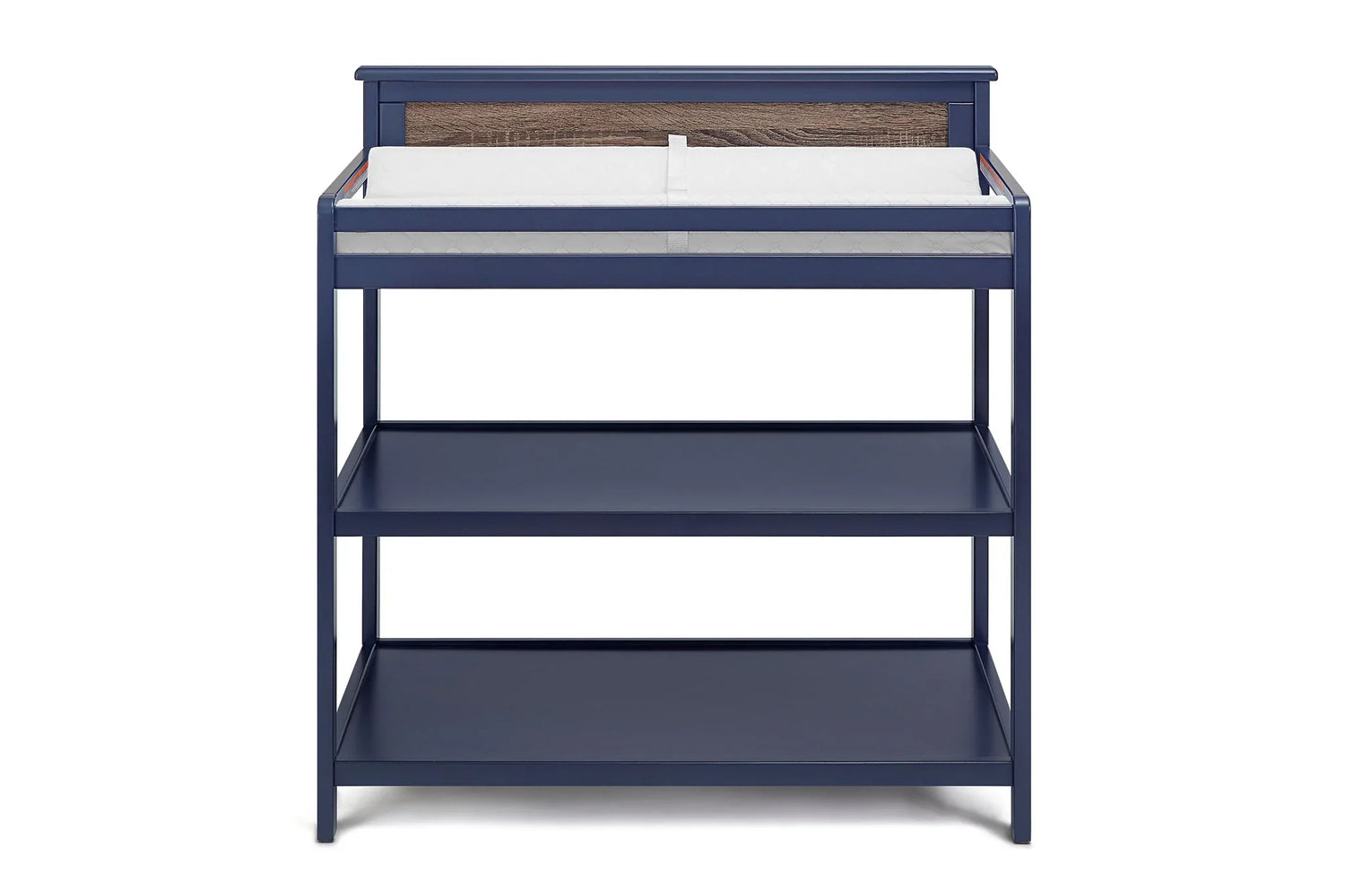 Wipe painted and wood‑tone surfaces with a soft, damp cloth and mild soap as needed; avoid abrasive cleaners or prolonged exposure to moisture. For spills on the changing surface, clean promptly and allow to air dry. Check fasteners periodically and tighten if necessary to maintain stability.