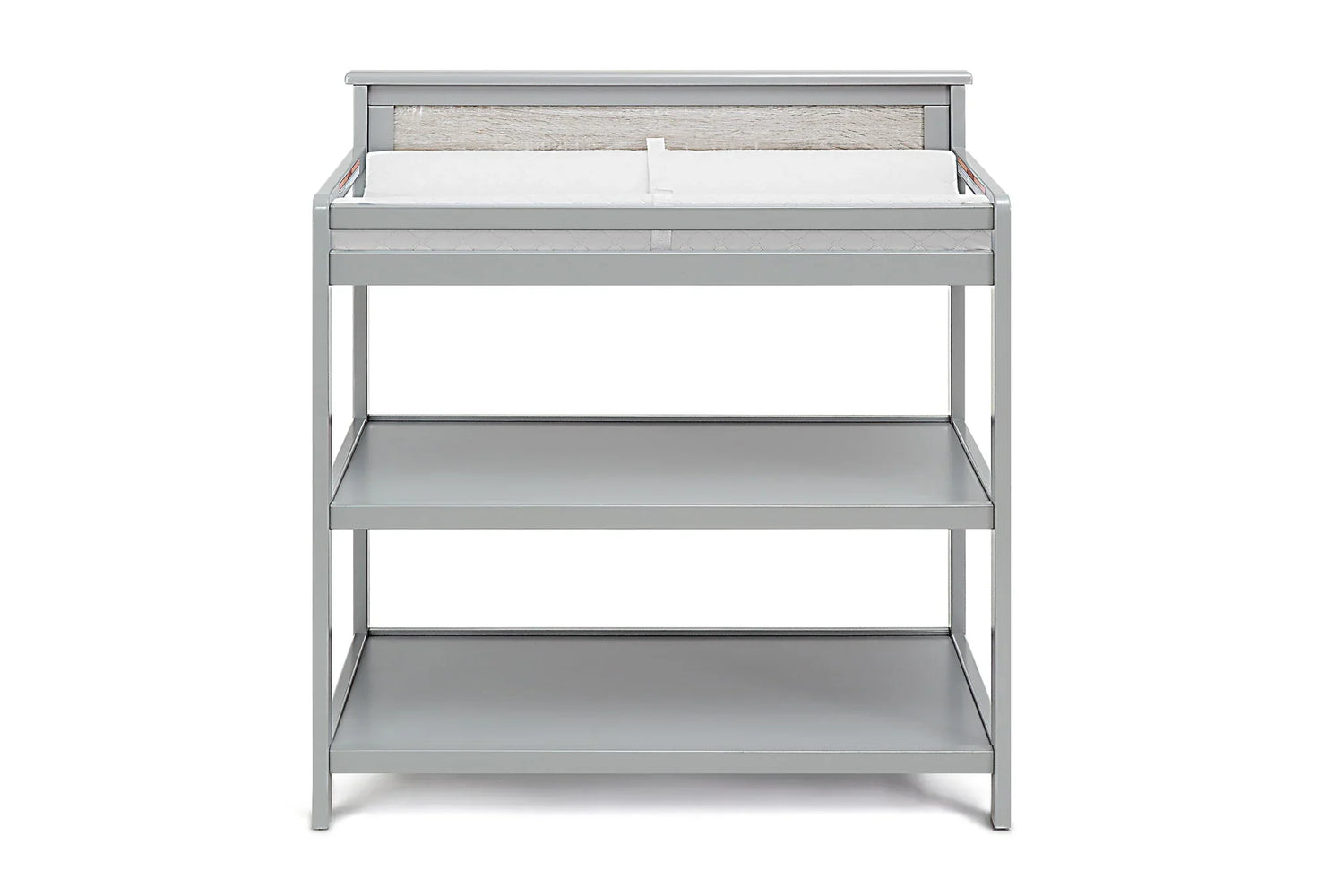 - Storage: Two open shelves beneath the changing surface for diapers, wipes, bath items and folded linens.