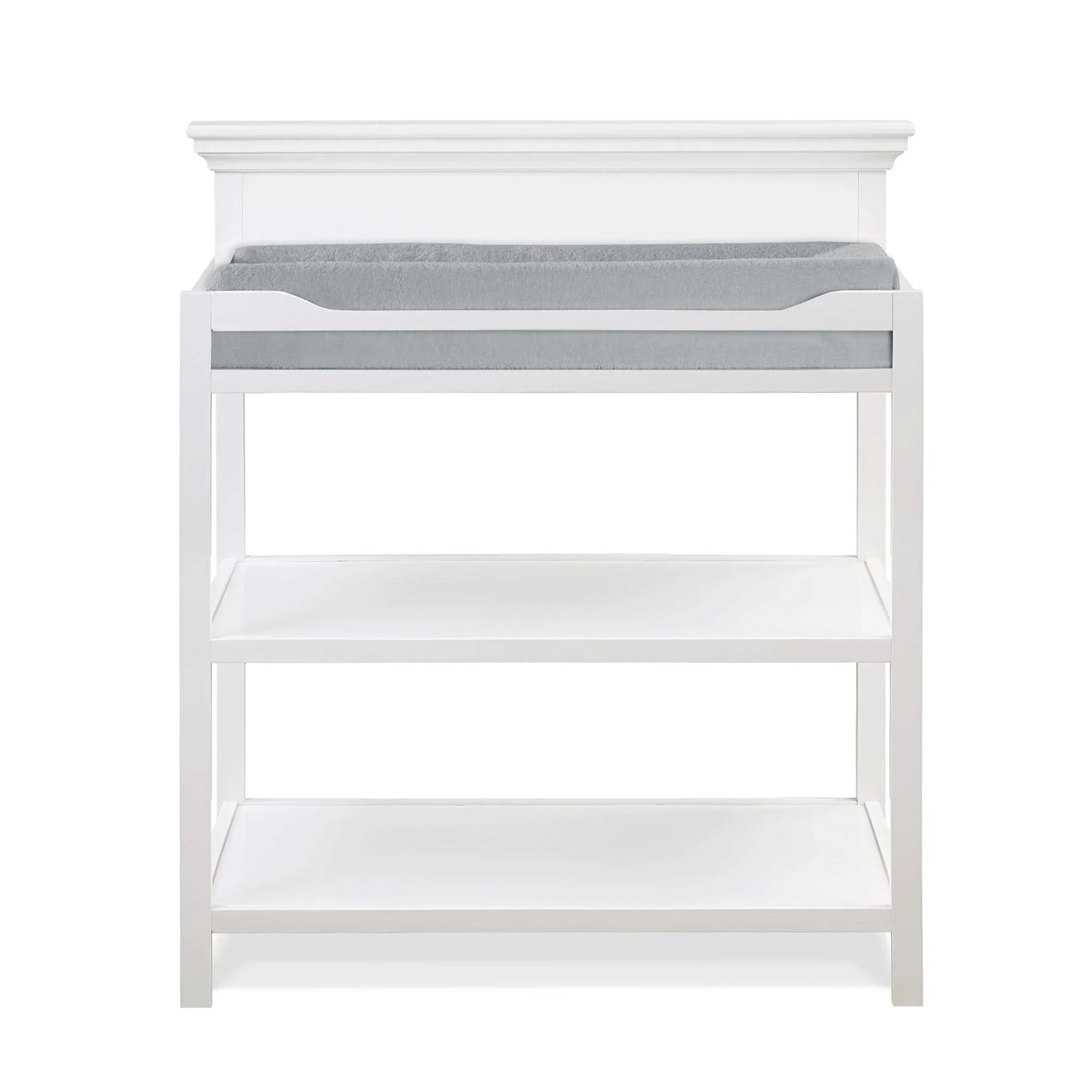 Built from painted wood with a soft, neutral finish visible in product images, this piece balances practical function with simple, timeless lines. The two roomy open shelves keep supplies within reach during changes, while the raised backboard adds a finished look that suits modern and classic nurseries alike. Screens and natural materials may show slight color variation.