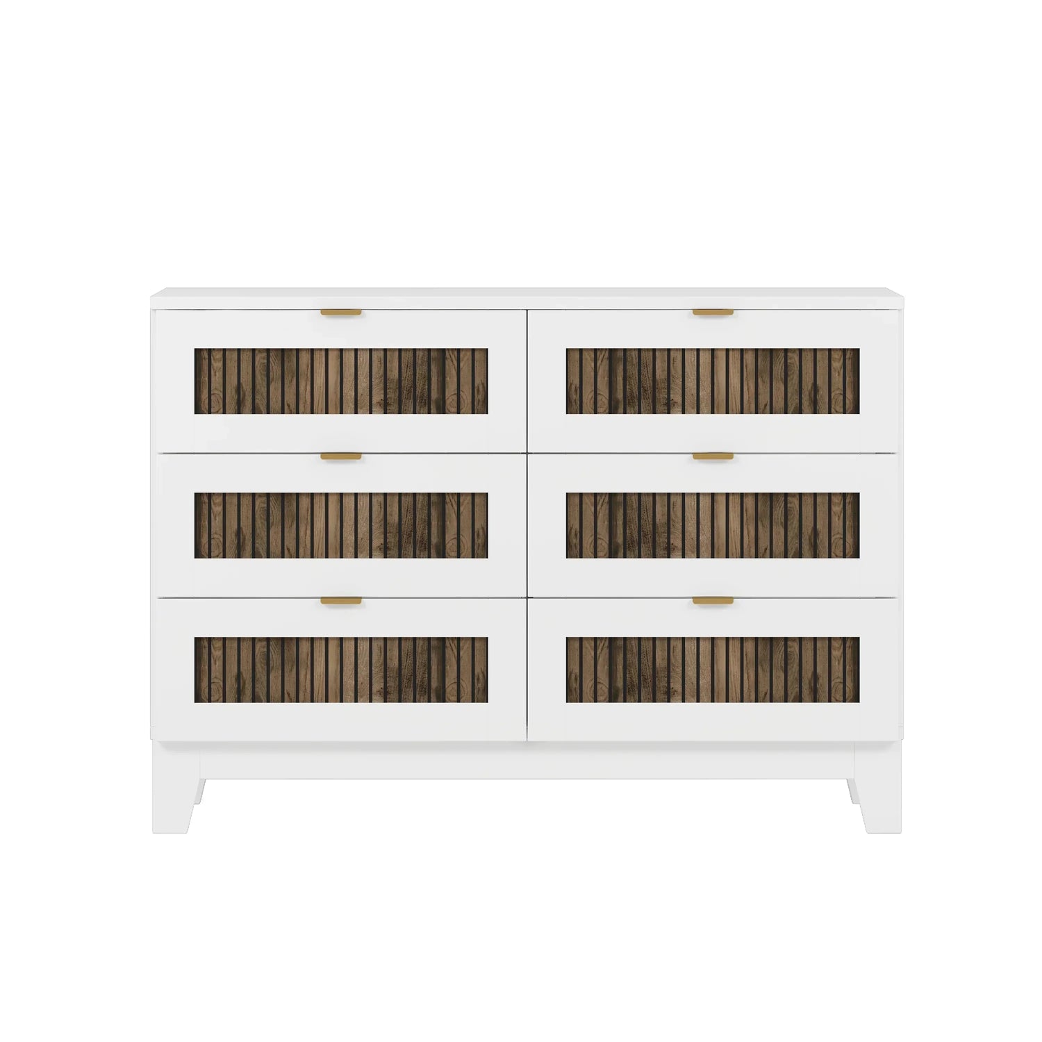 Finish & color: Sleek white finish with warm wood slat insets. The white reads neutral and bright while the slatted wood panels add honey/awn undertones for contrast. Natural materials and screen settings may create slight variation in tone.