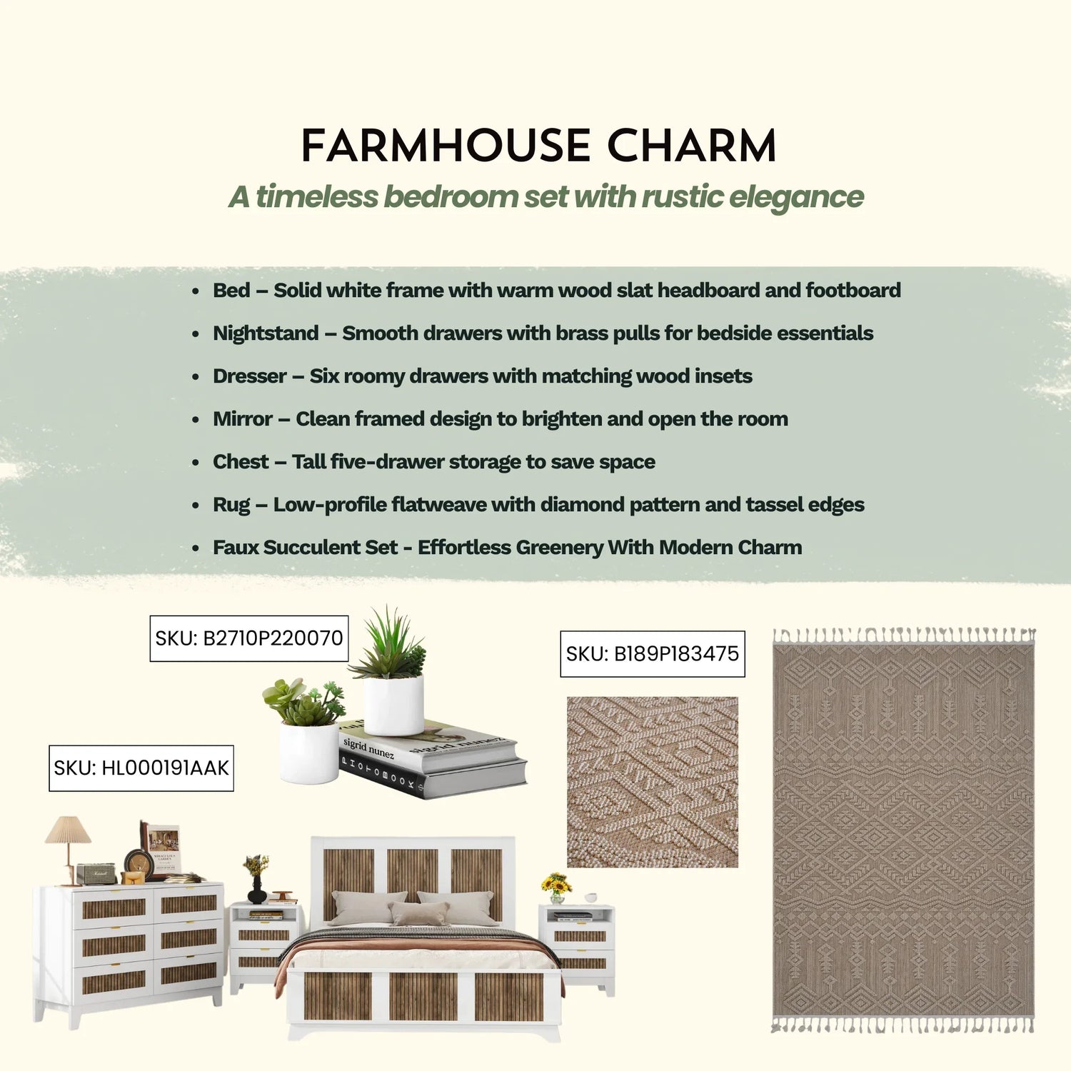 • Coordinated aesthetic: Matching white finish and warm wood slat details create a unified modern farmhouse look across bed, nightstands, and dresser.
