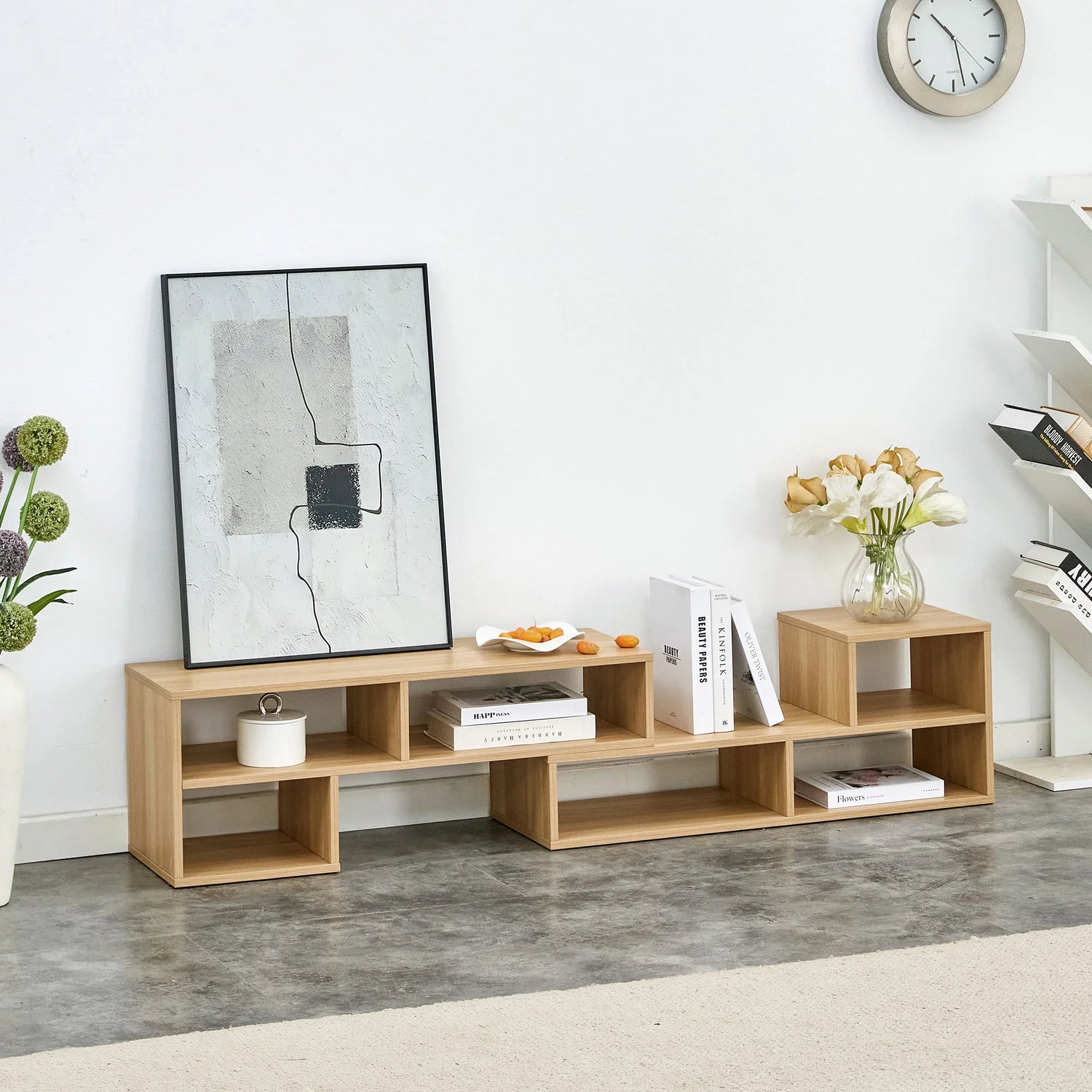 Use it as a TV stand or a low bookshelf: the design highlights six open compartments that let you display books, consoles and decorative accents with balanced negative space. Constructed from engineered wood with a light woodgrain finish, the finish reads as a warm, natural oak tone; as with any wood-look surface, grain and color may vary slightly between screens and production runs.