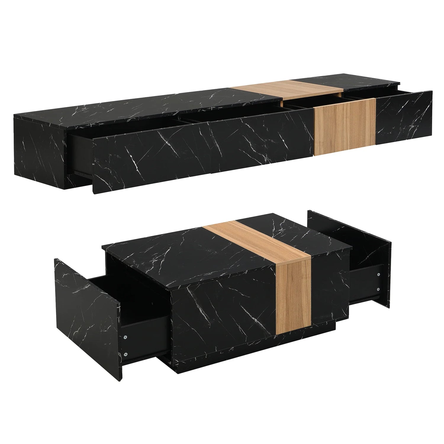 This modern TV stand is for anyone looking to anchor a contemporary living room with a low-profile media console that balances dramatic black faux-marble styling and warm wood accents. It’s built to sit beneath large flat-panel TVs and to hide media clutter while keeping remotes, consoles and streaming boxes within easy reach.