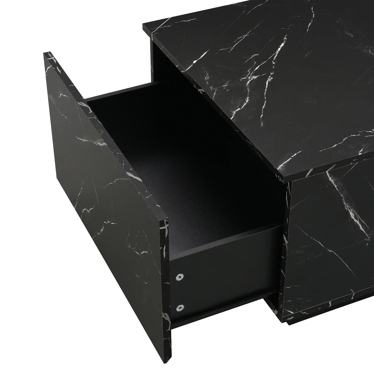 Use it as the centerpiece for a minimalist lounge, a media wall, or a hotel-like suite — the smooth faux-marble top and wood-accent middle insert give the unit a high-end look while the practical particle-board construction keeps the price and maintenance simple. The design pairs well with low sofas, floating shelves, and neutral palettes; note that natural lighting and screen displays can produce slight variation in the wood-grain and marble print.