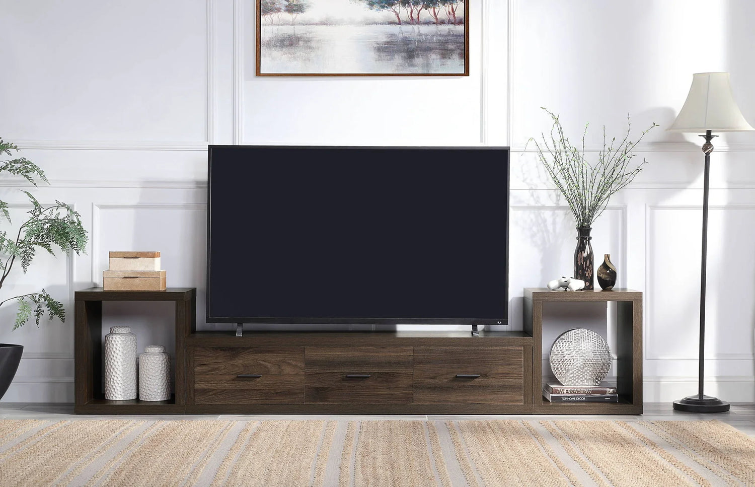 • Ample Storage: Equipped with three spacious storage drawers on metal center glides with 3/4 extension and built-in safety stops, it offers convenient and secure organization for your entertainment essentials.