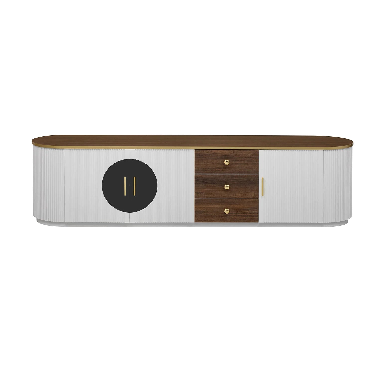 - Elegant Design: This TV stand features a classic color scheme with a tabletop adorned by imitation wood grain veneer and gold accents, creating an ambiance of understated luxury. The curved sides with vertical grooves enhance its dynamic beauty, allowing it to integrate seamlessly into various home styles.