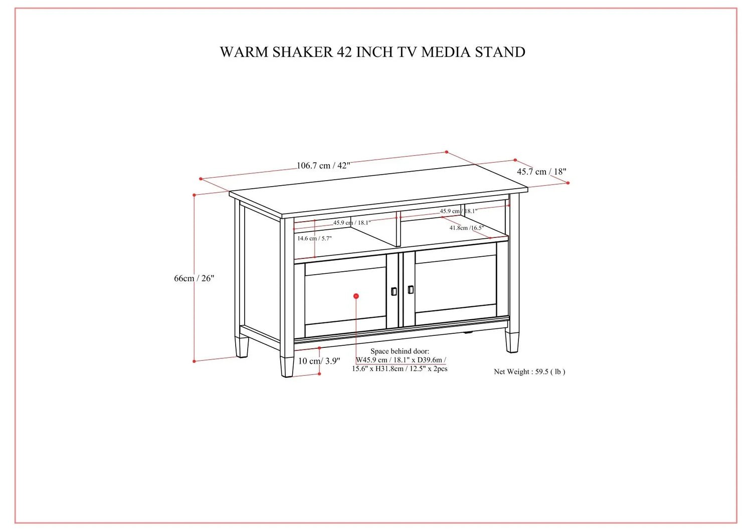 Perfect for someone who wants a warm, transitional centerpiece for a living room, den, or condo media wall. This handcrafted TV media stand brings the clean lines of shaker design and the richness of solid wood to everyday living — ideal for families or design-conscious renters who need durable, attractive storage for a TV, streaming devices and media accessories.