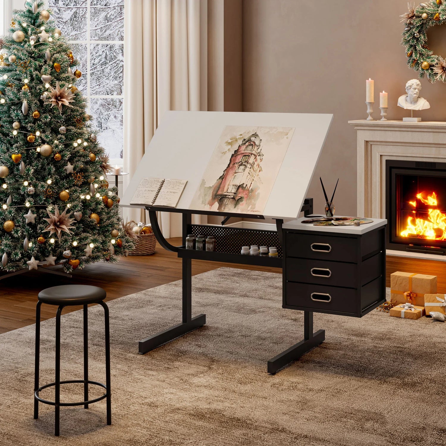 Adjustable Drafting Drawing Table With Stool And 3 Drawers - White / Black