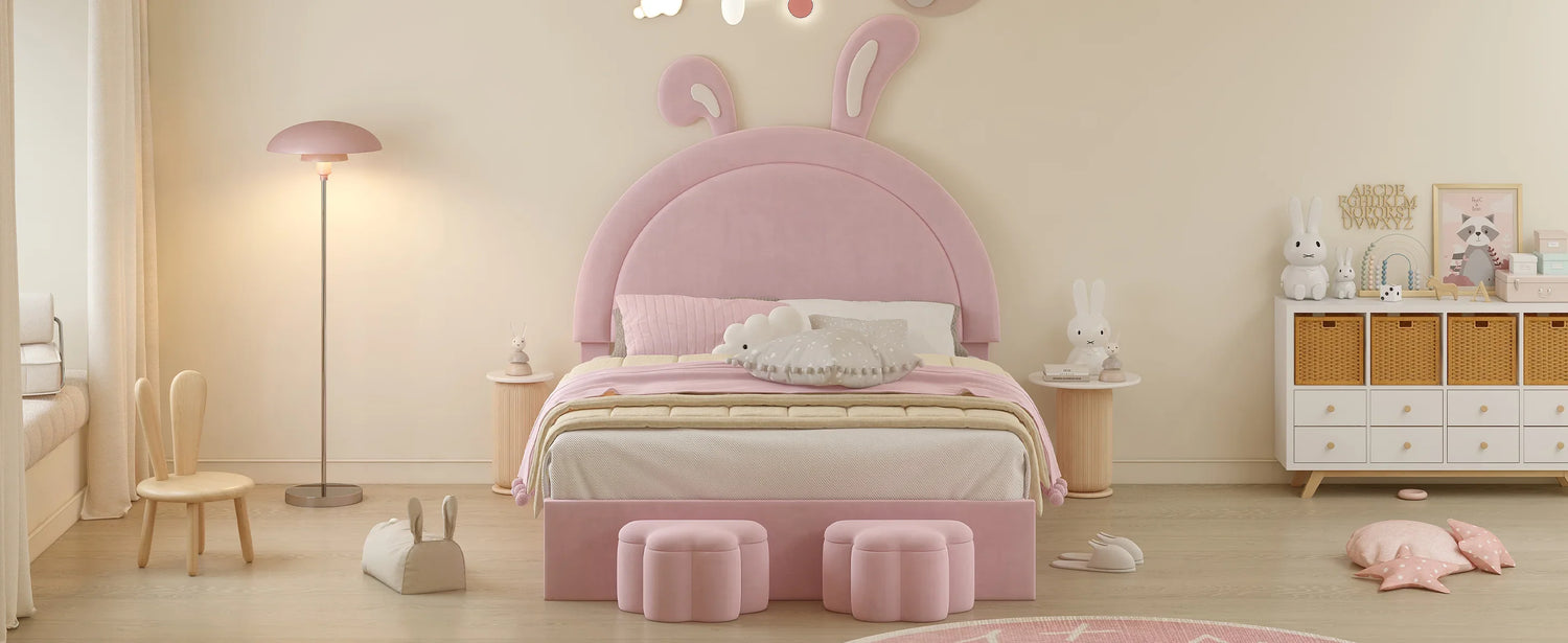 - Bring joy and charm to your child's bedroom with this adorable rabbit-shaped bed, designed to captivate and delight. Covered in soft velvet fabric, this bed offers a cozy, warm touch while adding a playful and imaginative element to the room. Built with durable MDF and plywood, it ensures long-lasting use and is perfect for accompanying your child through the years. The unique storage footstools, shaped like rabbit paws, enhance the bed’s whimsical appeal and provide convenient space for toys or books, making it an ideal choice for a child's cozy and fun-filled bedroom.